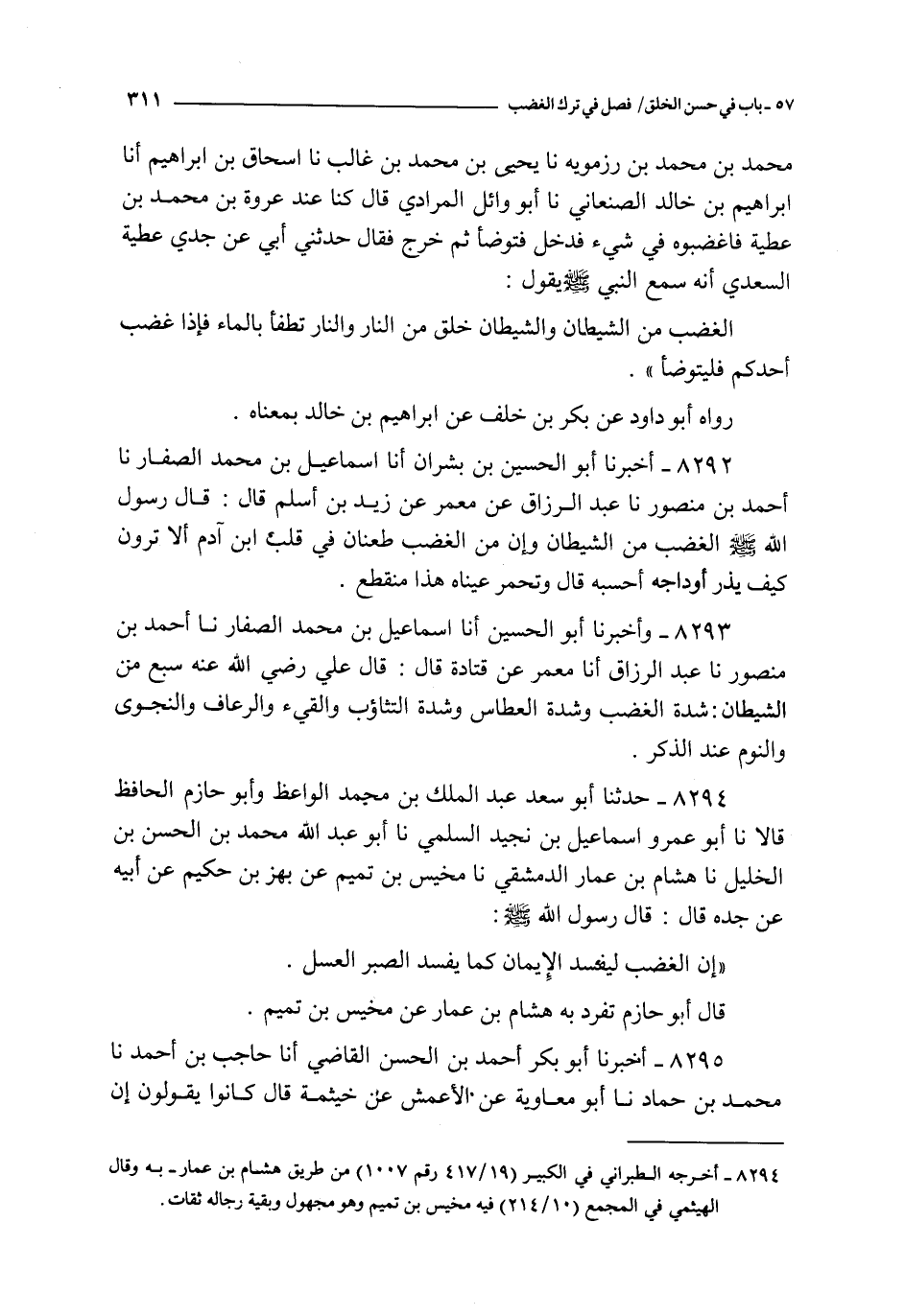 8292 - أخبرنا أبو الحسين بن بشران أنا إسماعيل بن محمد الصفار نا أحمد بن منصور نا عبد الرزاق عن معمر عن زيد بن أسلم قال : قال رسول الله صلى الله عليه و سلم الغضب من الشيطان و إن من الغضب طعنان في قلب ابن آدم ألا ترون كيف يذر أوداجه أحسبه قال و تحمر عيناه هذا منقطع