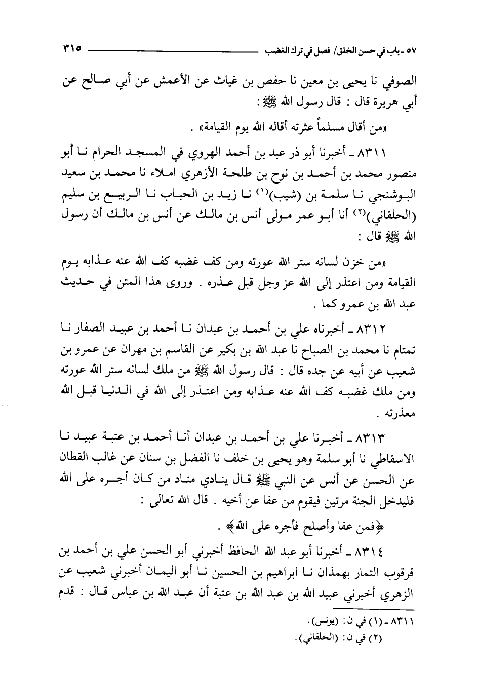 8312 - أخبرناه علي بن أحمد بن عبدان نا أحمد بن عبيد الصفار نا تمتام نا محمد بن الصباح نا عبد الله بن بكير عن القاسم بن مهران عن عمرو بن شعيب عن أبيه عن جده قال : قال رسول الله صلى الله عليه و سلم من ملك لسانه ستر الله عورته و من ملك غضبه كف الله عنه عذابه و من اعتذر إلى الله في الدنيا قبل الله معذرته