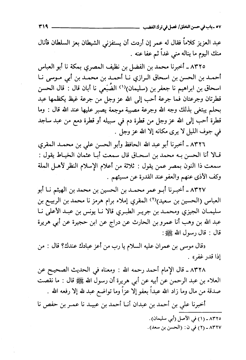 8325 - أخبرنا محمد بن الفضل بن نظيف المصري بمكة نا أبو العباس أحمد بن الحسن بن إسحاق الرازي نا أحمد بن محمد بن أبي موسى نا إسحاق بن إبراهيم نا جعفر بن سليمان الضبعي نا أبان قال : قال الحسن قطرتان و جرعتان فما جرعة أحب إلى الله عز و جل من جرعة غيظ يكظمها عبد بحلم يبتغي بذلك وجه الله و جرعة مصيبة موجعة يصبر عليها عند الله قال : و ما قطرة أحب إلى الله عز و جل من قطرة دم في سبيله أو قطرة دمع من عبد ساجد في جوف الليل لا يرى مكانه إلا الله عز و جل