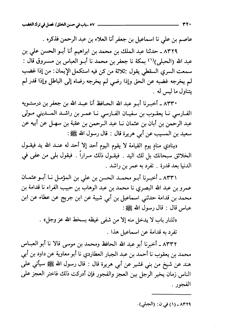 8329 - حدثنا عبد الملك بن محمد بن إبراهيم أنا أبو الحسن علي بن عبد الله الحبلى بمكة نا جعفر بن محمد نا أبو العباس بن مسروق قال : سمعت السري السقطي يقول : ثلاثة من كن فيه استكمل الإيمان : من إذا غضب لم يخرجه غضبه عن الحق و إذا رضي لم يخرجه رضاه إلى الباطل و إذا قدر لم يتناول ما ليس له