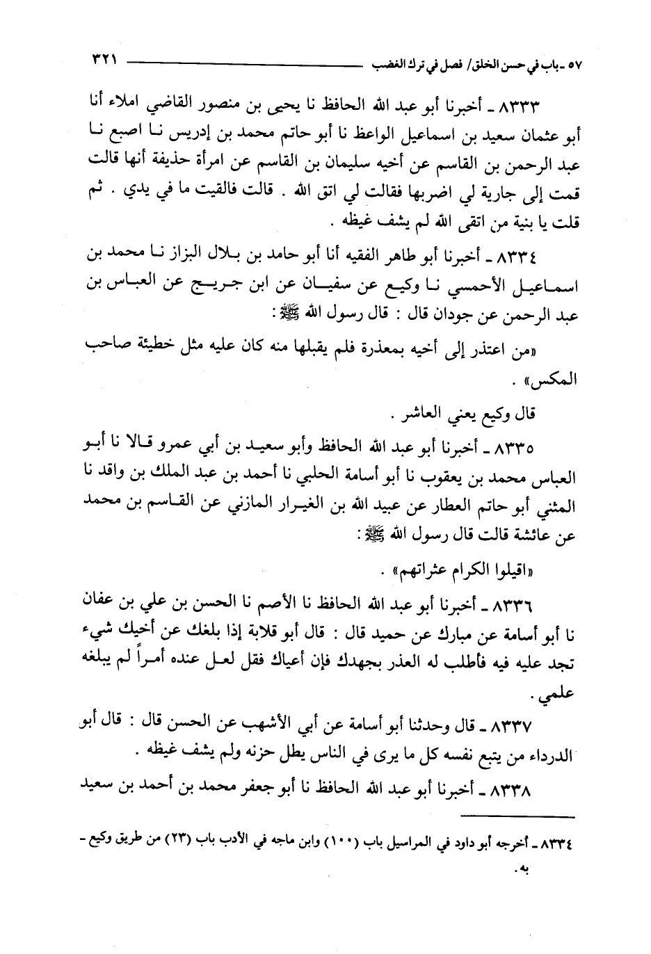 8336 - أخبرنا أبو عبد الله الحافظ نا الأصم نا الحسن بن علي بن عفان نا أبو أسامة عن مبارك عن حميد قال : قال أبو قلابة : إذا بلغك عن أخيك شيء تجد عليه فيه فأطلب له العذر بجهدك فإن أعياك فقل لعل عنده أمرا لم يبلغه علمي