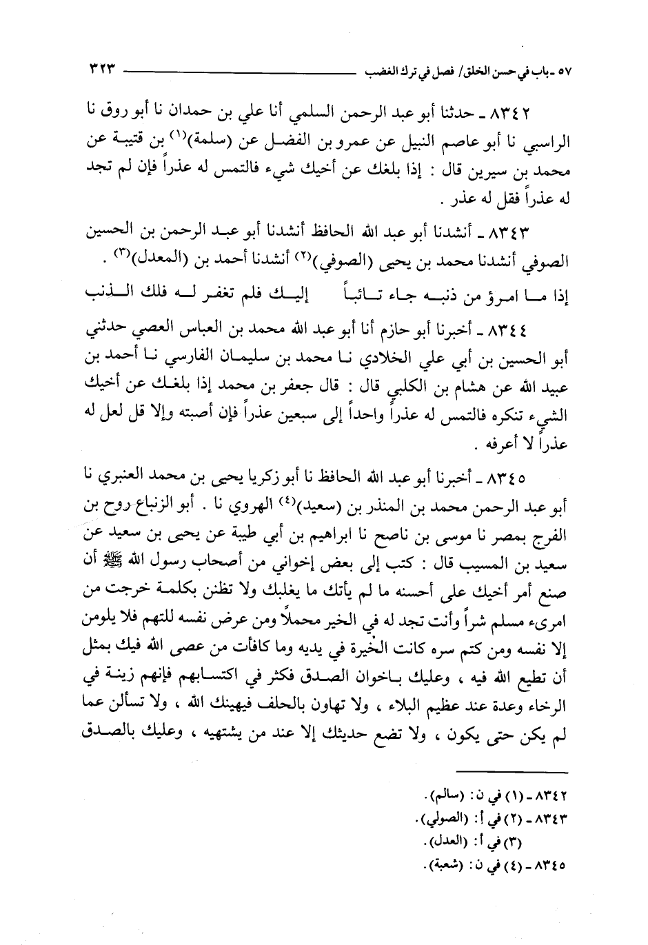 8342 - حدثنا أبو عبد الرحمن السلمي أنا علي بن حمدان نا أبو روق نا الراسبي نا أبو عاصم النبيل عن عمرو بن الفضل عن سلمة بن قتيبة عن محمد بن سيرين قال : إذا بلغك عن أخيك شيء فالتمس له عذرا فإن لم تجد له عذرا فقل له عذر