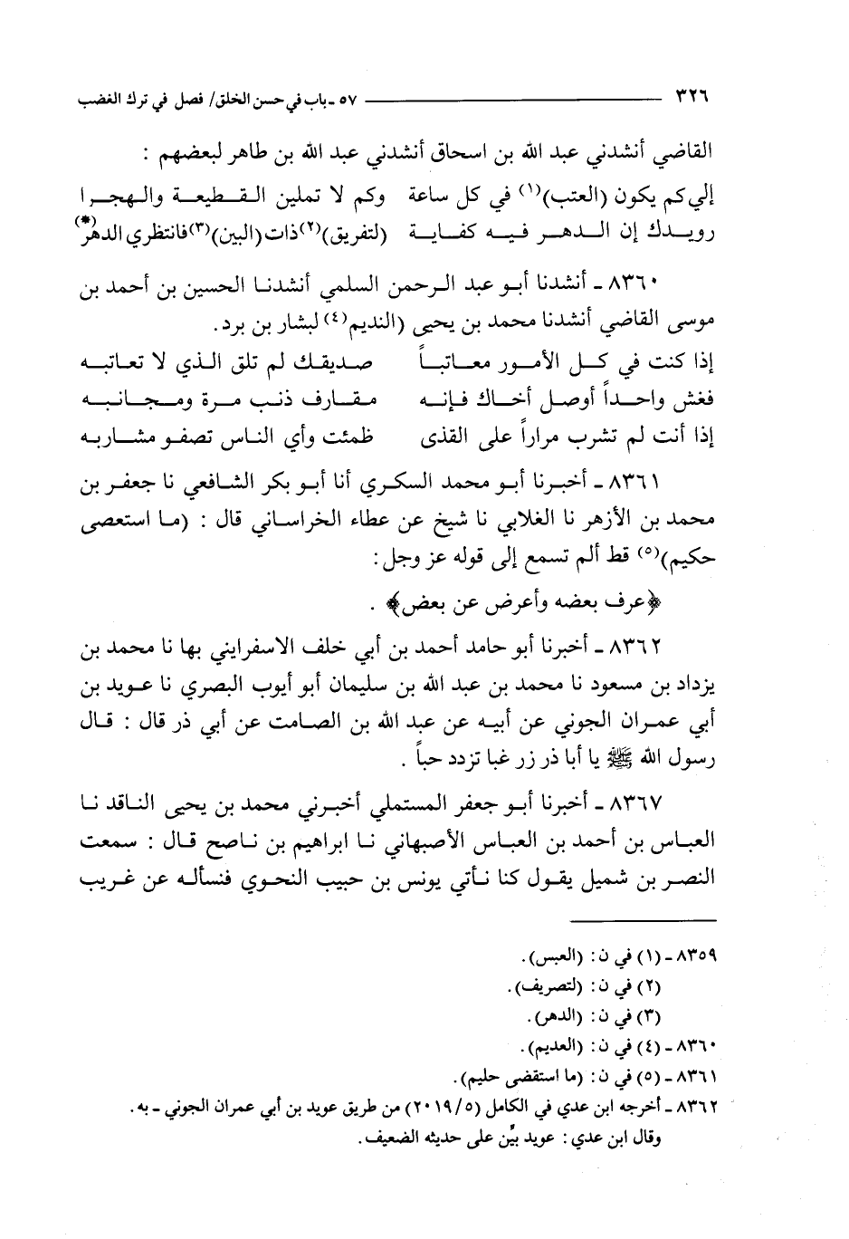 8360 - أنشدنا أبو عبد الرحمن السلمي أنشدنا الحسين بن أحمد بن موسى القاضي أنشدنا محمد بن يحيى النديم لبشار بن برد : ـ ( إذا كنت في كل الأمور معاتبا صديقك لم تلق الذي لا تعاتبه )