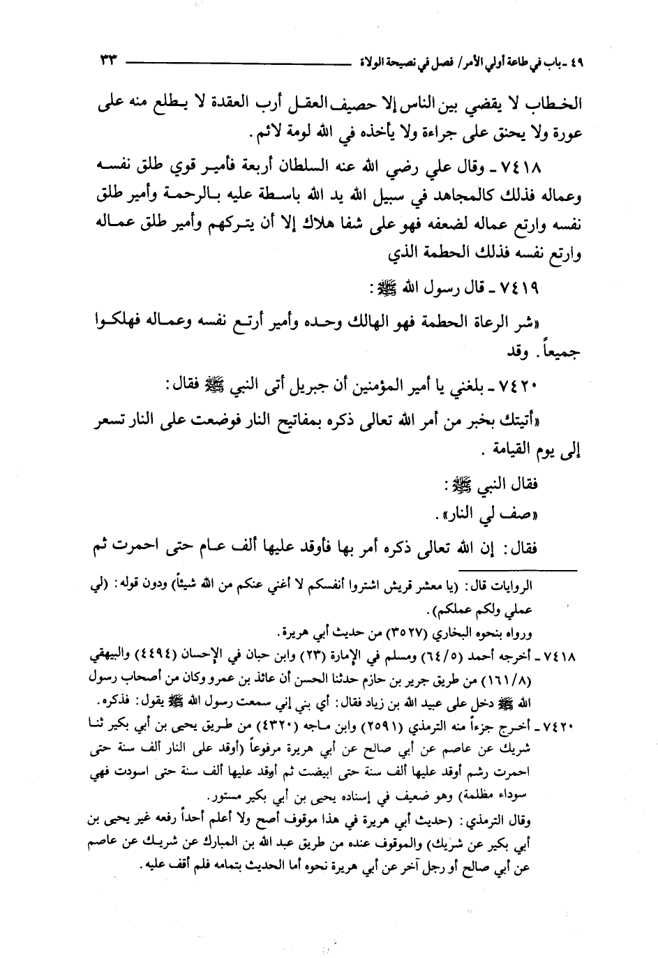 7418 - و قال علي رضي الله عنه : السلطان أربعة فأمير قوي طلق نفسه و عماله فذلك كالمجاهد في سبيل الله يد الله باسطة عليه بالرحمن و أمير طلق نفسه و ارتع عماله لضعفه فهو على شفا هلاك إلا أن يتركهم و أمير طلق عماله و ارتع نفسه فذلك الحطمة الذي
