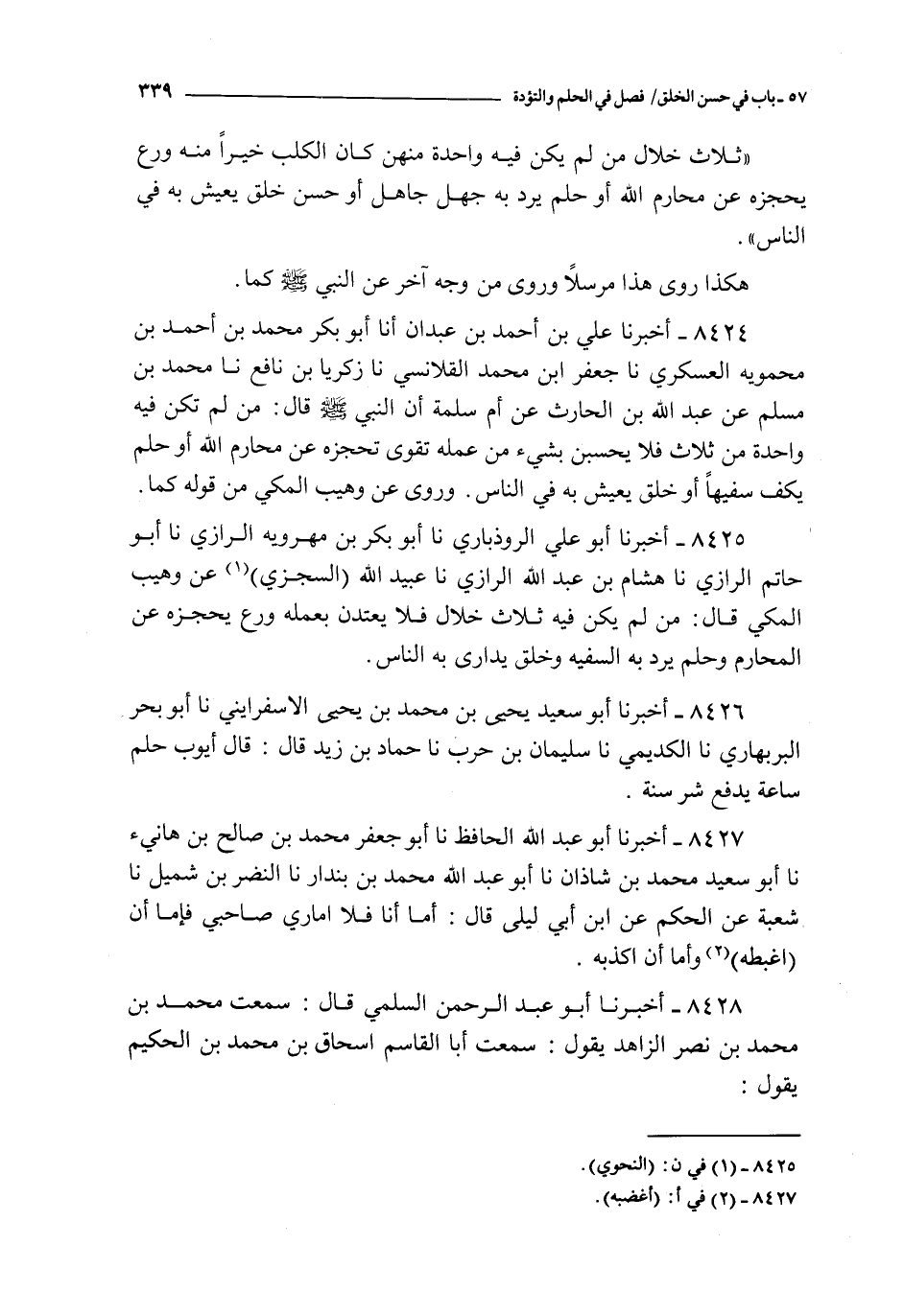 8425 - أخبرنا أبو علي الروذباري نا أبو بكر بن مهرويه الرازي نا أبو حاتم الرازي نا هشام بن عبد الله الرازي نا عبيد الله السجزي عن وهيب المكي قال : من لم يكن فيه ثلاث خلال فلا يعتدن بعمله ورع يحجزه عن المحارم و حلم يرد به السفيه و خلق يدارى به الناس