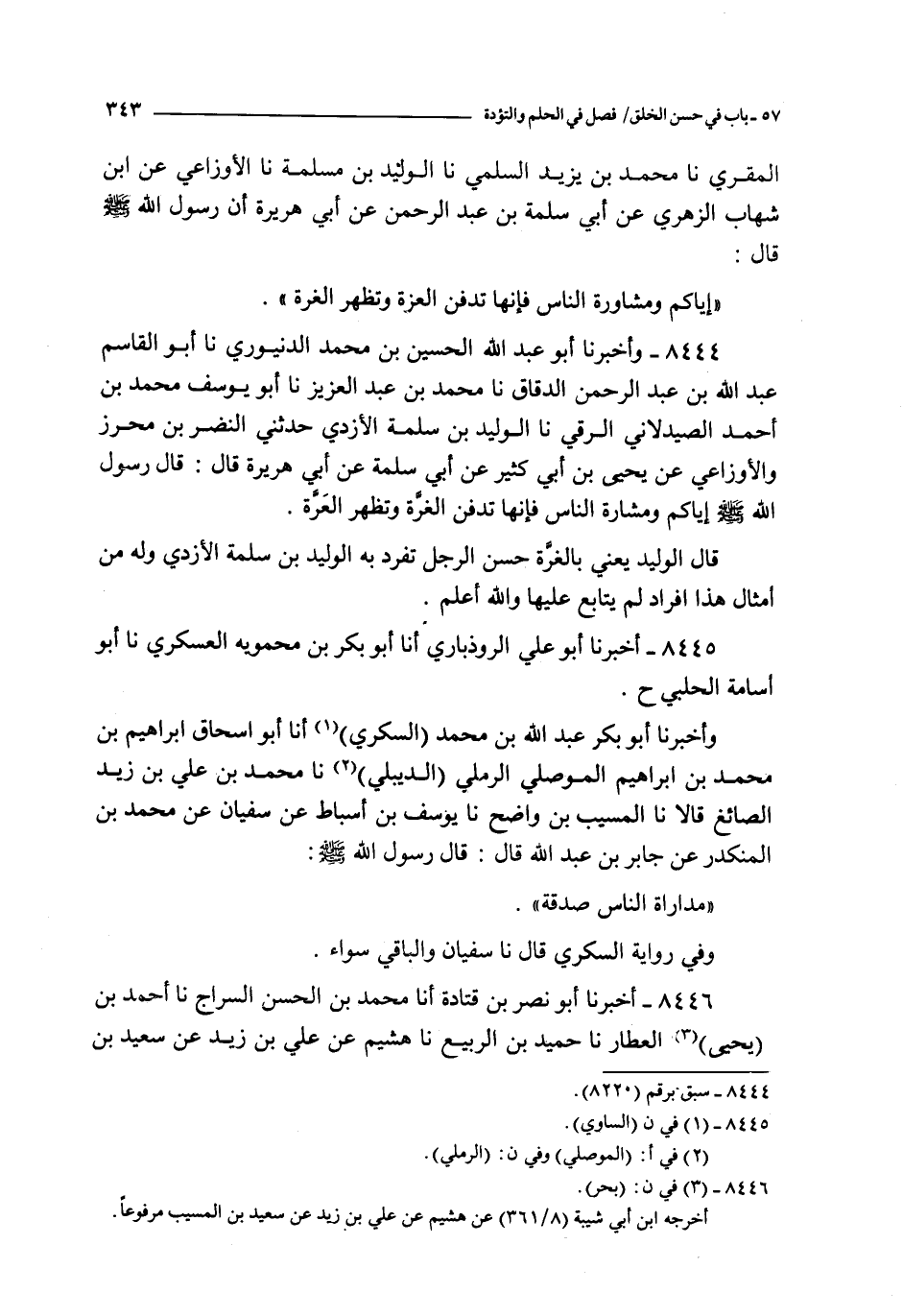 8444 - و أخبرنا أبو عبد الله الحسين بن محمد الدنيوري نا أبو القاسم عبد الله بن عبد الرحمن الدقاق نا محمد بن عبد العزيز نا أبو يوسف محمد بن أحمد الصيدلاني الرقي نا الوليد بن سلمة الأزدي حدثني النضر بن محرز و الأوزاعي عن يحيى بن أبي كثير عن أبي سلمة عن أبي هريرة قال : قال رسول الله إياكم و مشارة الناس فإنها تدفن الغرة وتظهر العرة