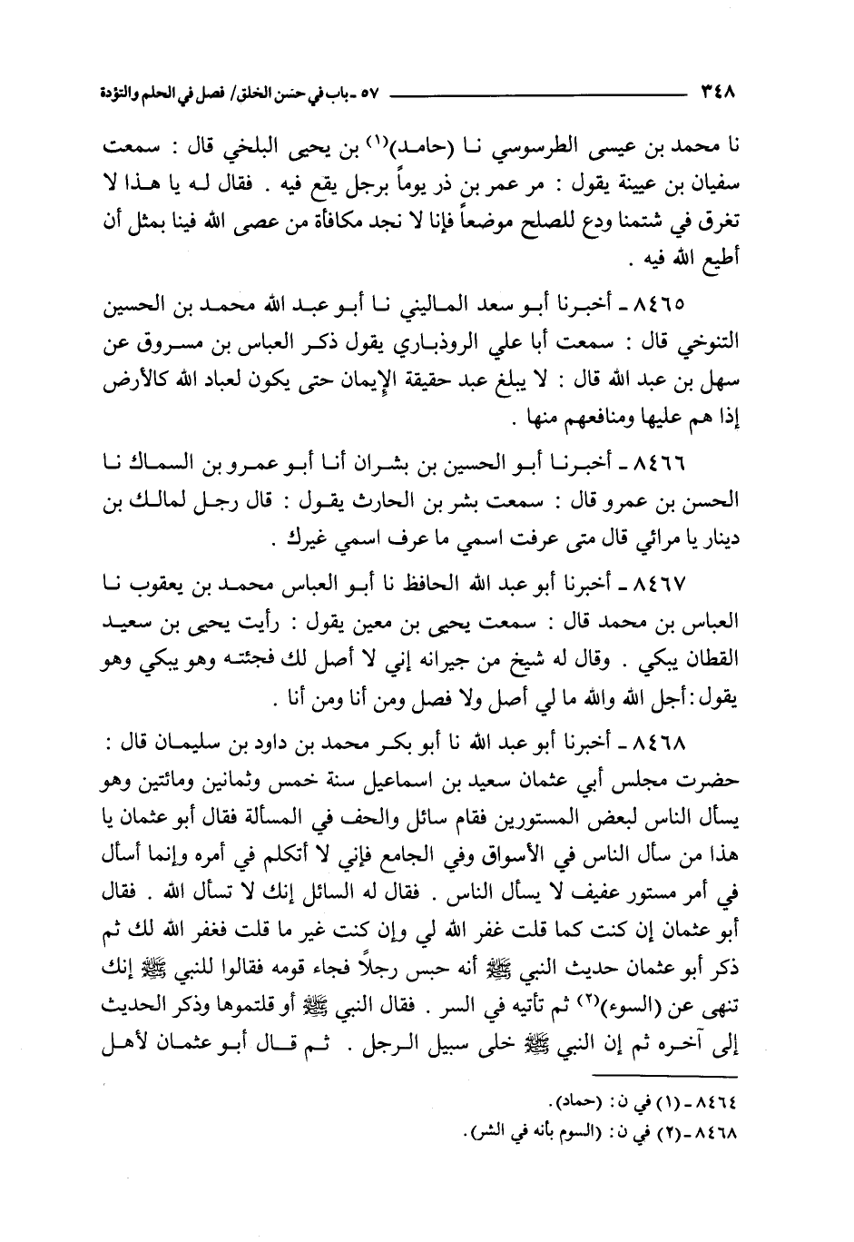 8468 - أخبرنا أبو عبد الله نا أبو بكر محمد بن داود بن سليمان قال : حضرت مجلس أبي عثمان سعيد بن إسماعيل سنة خمس و ثمانين و مائتين و هو يسأل الناس لبعض المستورين فقال سائل و الحف في المسألة فقال أبو عثمان يا هذا من سأل الناس في الأسواق و في الجامع فإني لا أتكلم في أمره و إنما أسأل في أمر مستور عفيف لا يسأل الناس فقال له السائل إنك لا تسأل الله فقال أبو عثمان إن كنت كما قلت غفر الله لي و إن كنت غير ما قلت فغفر الله لك ثم ذكر أبو عثمان حديث النبي صلى الله عليه و سلم أنه حبس رجلا فجاء قومه فقالوا للنبي صلى الله عليه و سلم إنك تنهى عن السوء ثم تأتيه في السر فقال النبي صلى الله عليه و سلم أو قلتموها و ذكر الحديث إلى آخره ثم إن النبي صلى الله عليه و سلم خلى سبيل الرجل ثم قال أبو عثمان لأهل المجلس : كل من أراد كرامتي فليكرم هذا السائل