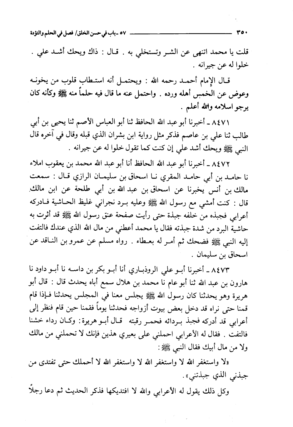 8472 - أخبرنا أبو عبد الله الحافظ أنا أبو عبد الله بن يعقوب إملاء نا حامد بن أبي حامد المقري نا إسحاق بن سليمان الرازي قال : سمعت مالك بن أنس يخبرنا عن إسحاق بن عبد الله بن أبي طلحة عن ابن مالك قال : كنت أمشي مع رسول الله صلى الله عليه و سلم و عليه برد نجراني غليظ الحاشية فأدركه أعرابي فجبذه من خلفه جبذة حتى رأيت صفحة عنق رسول الله صلى الله عليه و سلم قد أثرت به حاشية البرد منشدة جبذته فقال يا محمد أعطني من مال الله الذي عندك فالتفت إليه النبي صلى الله عليه و سلم فضحك ثم أمر له بعطاء رواه مسلم عن عمرو بن الناقد عن إسحاق بن سليمان