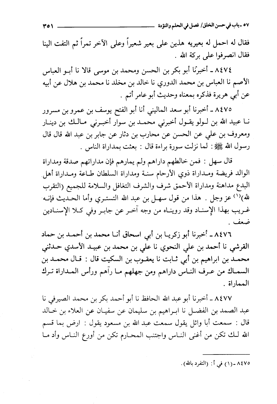 8475 - أخبرنا أبو سعد الماليني أنا أبو الفتح يوسف بن عمرو بن مسرور نا عبيد الله بن لولو يقول أخبرني محمد بن سوار أخبرني مالك بن دينار و معروف بن علي عن الحسن عن محارب بن دثار عن جابر بن عبد الله قال : قال رسول الله صلى الله عليه و سلم : لما نزلت سورة براءة قال : بعثت بمداراة الناس