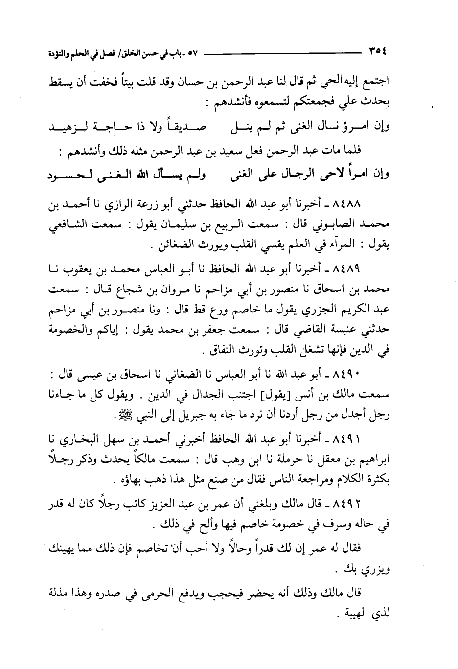 8491 - أخبرنا أبو عبد الله الحافظ أخبرني أحمد بن سهل البخاري نا إبراهيم بن معقل نا حرملة نا ابن وهب قال : سمعت مالكا : يحدث و ذكر رجلا بكثرة الكلام ومراجعة الناس فقال من صنع مثل هذا ذهب بهاؤه