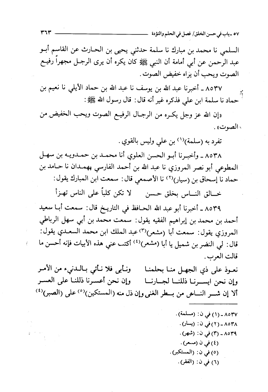 8538 - و أخبرنا أبو الحسن العلوي أنا محمد بن حمدويه بن سهل المطوعي أبو نصر المروزي نا عبد الله بن أحمد الفارسي بهمدان نا حامد بن حماد نا إسحاق بن سيار نا الأصمعي قال : سمعت ابن المبارك يقول : ـ ( خالق الناس بخلق حسن لا تكن كلبا على الناس تهزأ )