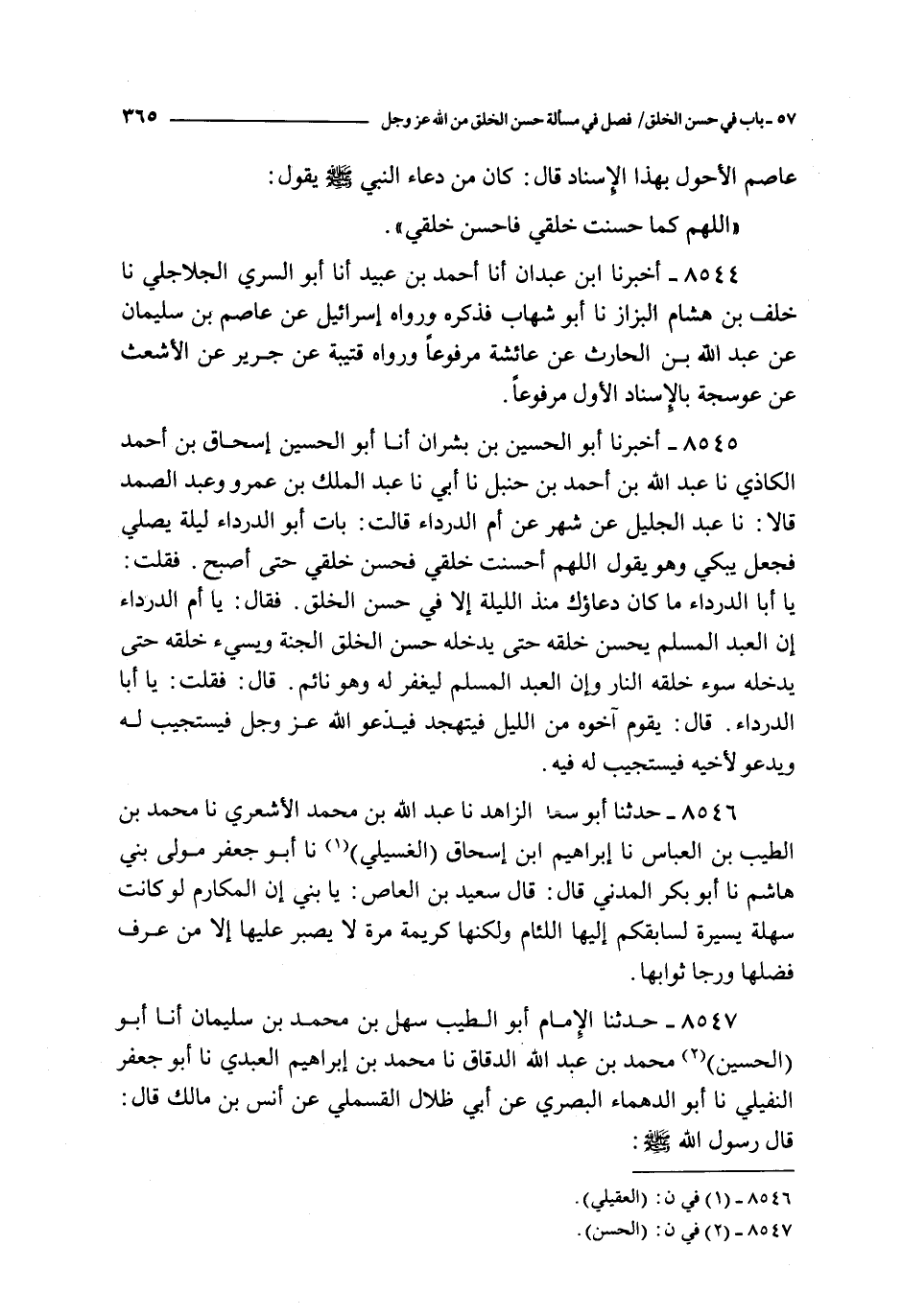8545 - أخبرنا أبو الحسين بن بشران أنا أبو الحسين إسحاق بن أحمد الكاذي نا عبد الله بن أحمد بن حنبل نا أبي نا عبد الملك بن عمرو و عبد الصمد قالا : نا عبد الجليل عن شهر عن أم الدرداء قالت : بات أبو الدرداء ليلة يصلي فجعل يبكي و هو يقول اللهم أحسنت خلقي فحسن خلقي حتى أصبح فقلت : يا أبا الدرداء ما كان دعاؤك منذ الليلة إلا في حسن الخلق فقال : يا أم الدرداء إن العبد المسلم يحسن خلقه حتى يدخله حسن الخلق الجنة و يسيء خلقه حتى يدخله سوء خلقه النار و إن العبد المسلم ليغفر له و هو نائم قال : فقلت : يا أبا الدرداء قال : يقوم أخوه من الليل فيتهجد فيدعو الله عز و جل فيستجيب له ويدعو لأخيه فيستجيب له فيه