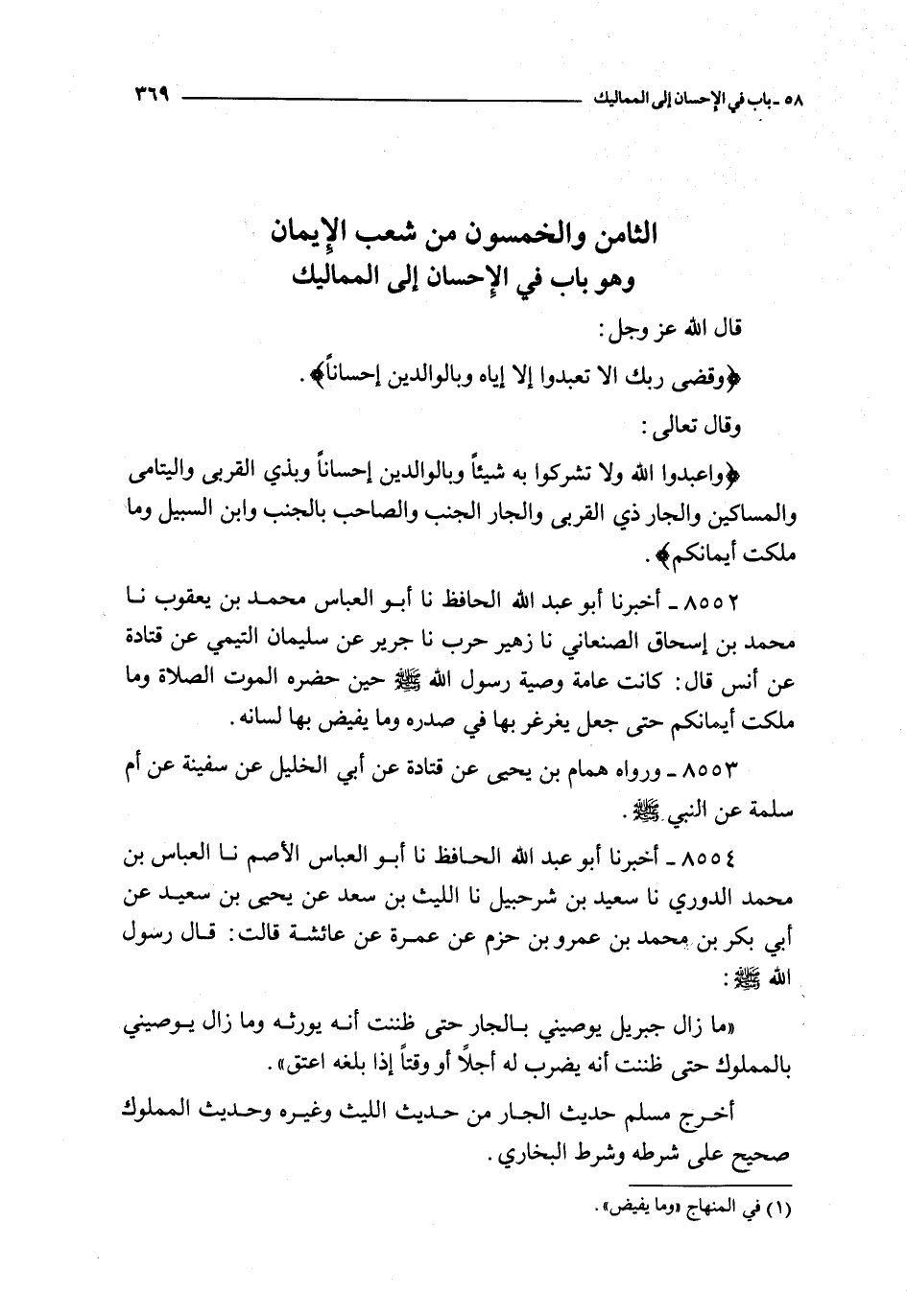 الثامن والخمسون من شعب الإيمان و هو باب في الإحسان إلى المماليك ـ قال الله عز و جل : { وقضى ربك أن لا تعبدوا إلا إياه و بالوالدين إحسانا } و قال تعالى : { اعبدوا الله ولا تشركوا به شيئا وبالوالدين إحسانا وبذي القربى واليتامى والمساكين والجار ذي القربى والجار الجنب والصاحب بالجنب وابن السبيل وما ملكت أيمانكم }