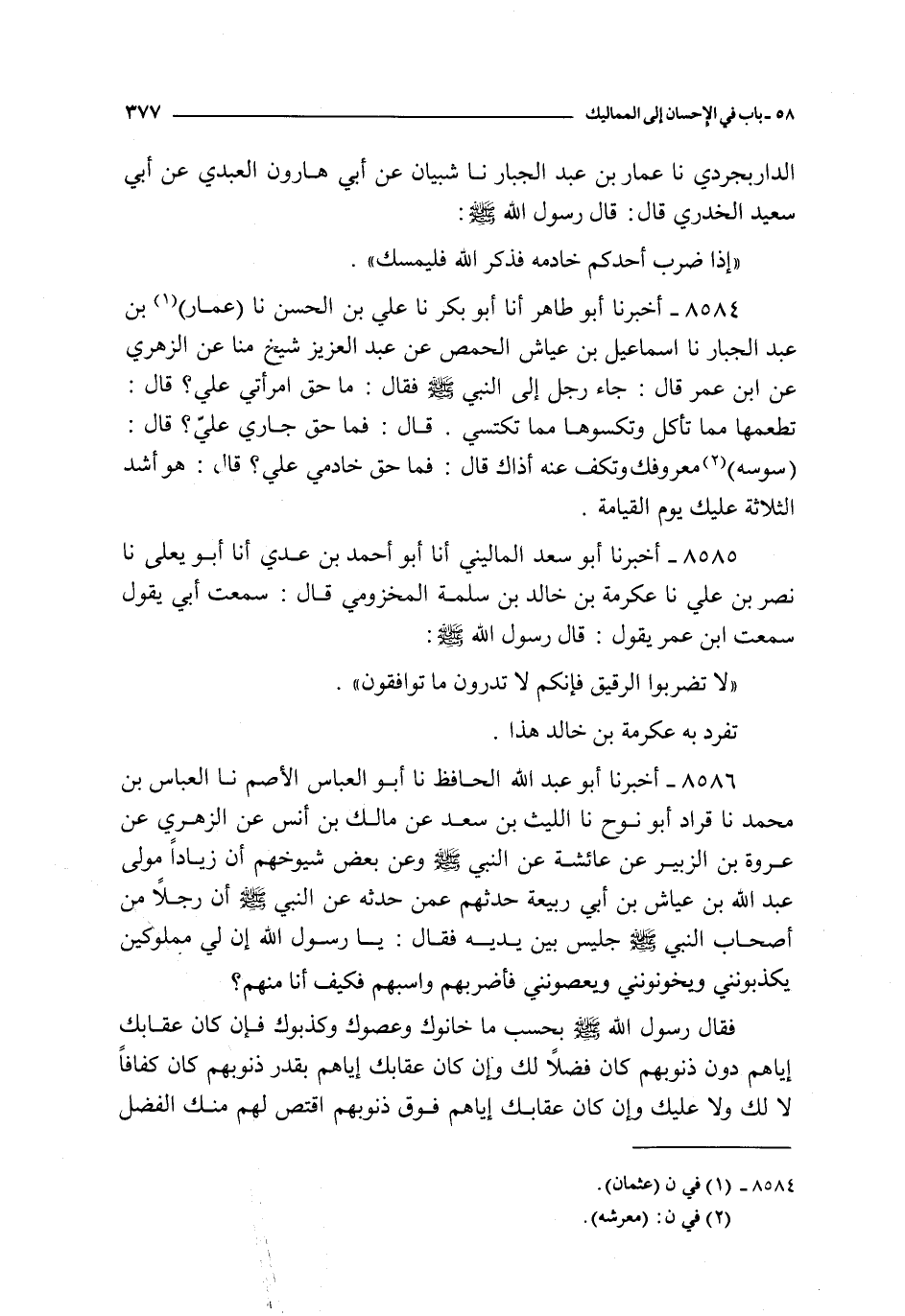 8584 - أخبرنا أبو طاهر أنا أبو بكر نا علي بن الحسن نا عمار بن عبد الجبار نا إسماعيل بن عياش الحمص عن عبد العزيز شيخ منا عن الزهري عن ابن عمر قال : جاء رجل إلى النبي صلى الله عليه و سلم فقال : ما حق امرأتي علي ؟ قال : تطعهما مما تأكل و تكسوها مما تكتسي قال : فما حق جاري علي ؟ قال : سوسه معروفك و تكف عنه أذاك قال : فما حق خادمي علي ؟ قال : هو أشد الثلاثة عليك يوم القيامة