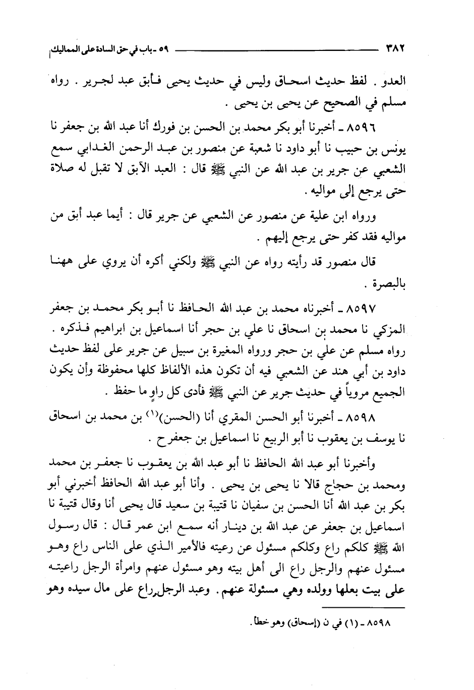و رواه ابن علية عن منصور عن الشعبي عن جرير قال : أيما عبد أبق من مواليه فقد كفر حتى يرجع إليهم
