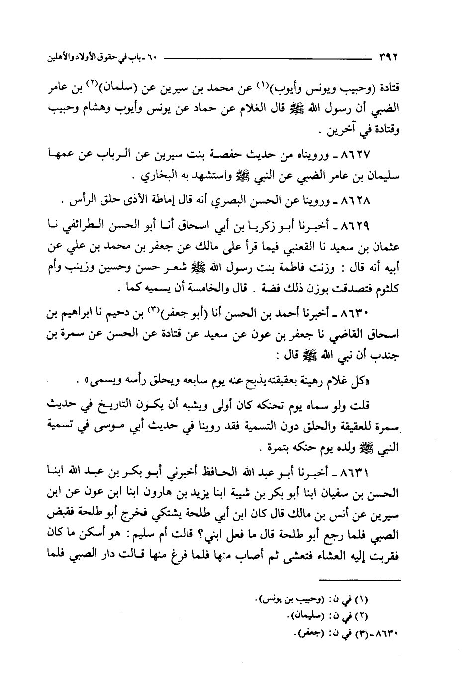 8629 - أخبرنا أبو زكريا بن أبي إسحاق أنا أبو الحسن الطرائفي نا عثمان بن سعيد نا القعنبي فيما قرأ على مالك عن جعفر بن محمد بن علي عن أبيه أنه قال : وزنت فاطمة بنت رسول الله صلى الله عليه و سلم شعر حسن و حسين و زينب و أم كلثوم فتصدقت بوزن ذلك فضة قال و الخامسة أن يسميه كما