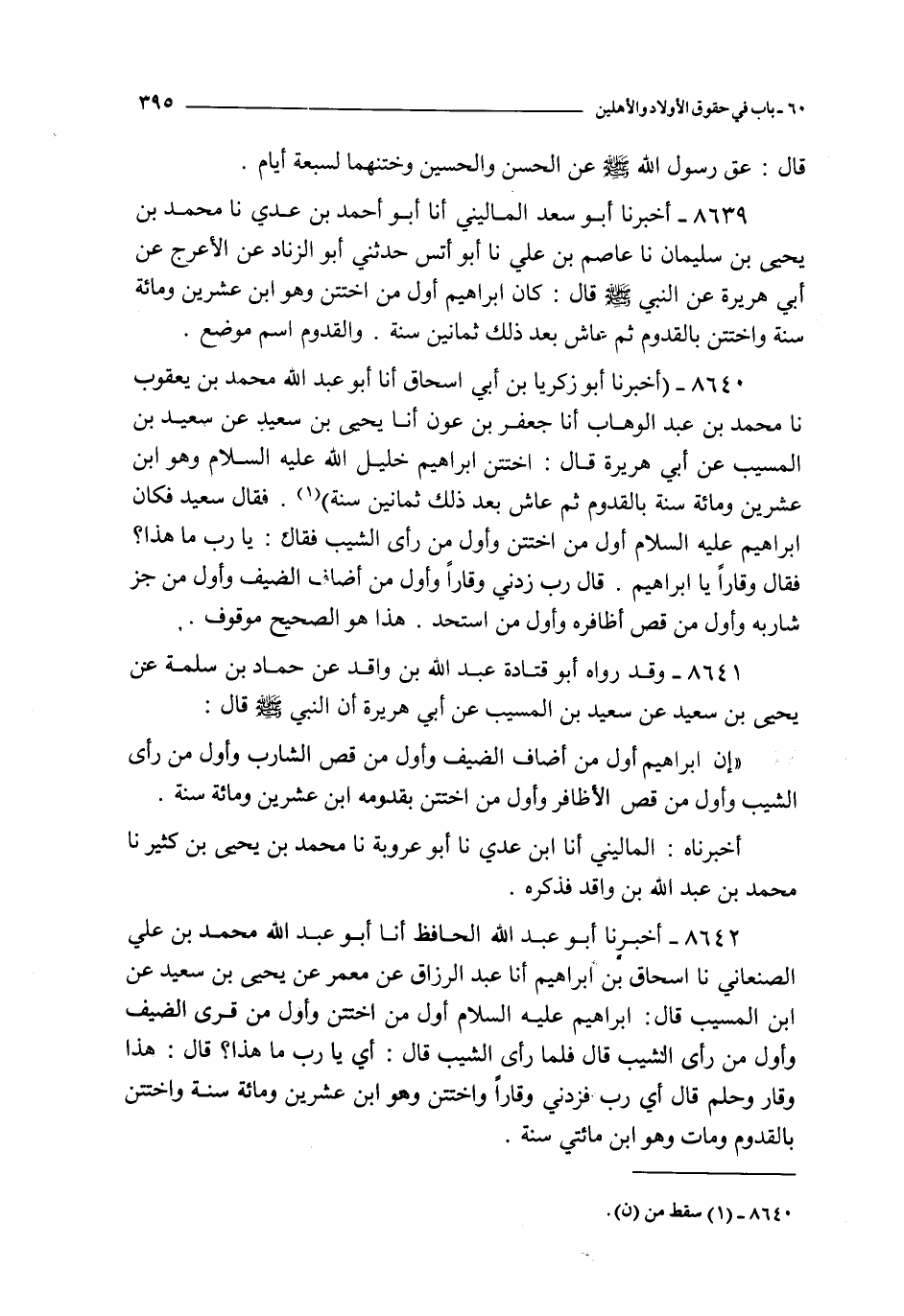 8639 - أخبرنا أبو سعد الماليني أنا أبو أحمد بن عدي نا محمد بن يحيى بن سليمان نا عاصم بن علي نا أبو أنس حدثني أبو الزناد عن الأعرج عن أبي هريرة : عن النبي قال : كان إبراهيم أول من اختتن و هو ابن عشرين ومائة سنة و اختتن بالقدوم ثم عاش بعد ذلك ثمانين سنة و القدوم اسم موضع