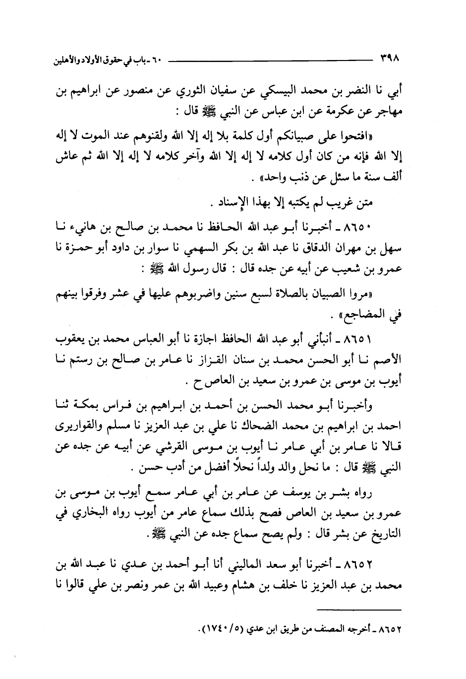 8650 - أخبرنا أبو عبد الله الحافظ نا محمد بن صالح بن هانئ نا سهل بن مهران الدقاق نا عبد الله بن بكر السهمي نا سوار بن داود أبو حمزة نا عمرو بن شعيب عن أبيه عن جده قال : قال رسول الله صلى الله عليه و سلم :