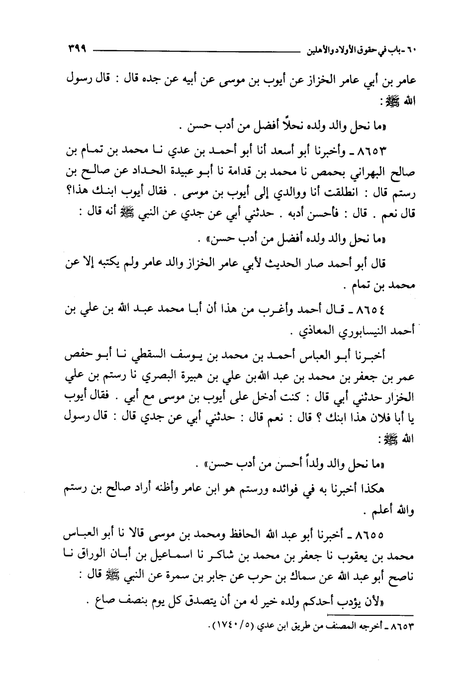 8653 - و أخبرنا أبو أسعد أنا أبو أحمد بن عدي نا محمد بن تمام بن صالح البهراني بحمص نا محمد بن قدامة نا أبو عبيدة الحداد عن صالح بن رستم قال : انطلقت أنا و والدي إلى أيوب بن موسى فقال أيوب ابنك هذا ؟ قال : نعم قال : فأحسن أدبه حدثني أبي عن جدي عن النبي صلى الله عليه و سلم أنه قال :
