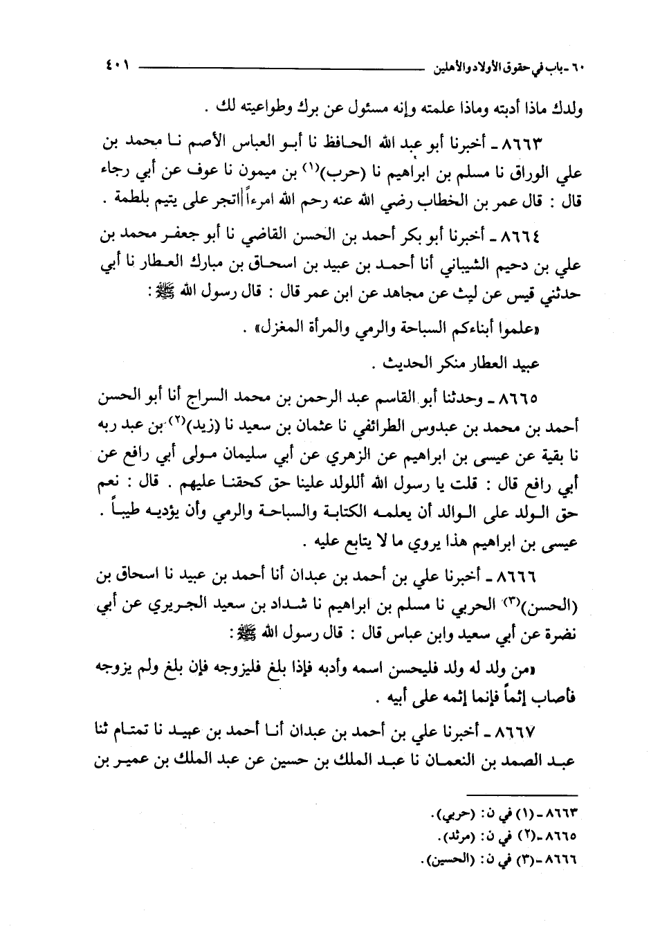 8665 - و حدثنا أبو القاسم عبد الرحمن بن محمد السراج أنا أبو الحسن أحمد بن محمد بن عبدوس الطرائفي نا عثمان بن سعيد نا زيد بن عبد ربه نا بقية عن عيسى بن إبراهيم عن الزهري عن أبي سليمان مولى أبي رافع عن أبي رافع قال : قلت يا رسول الله أللولد علينا حق كحقنا عليهم قال : نعم حق الولد على الوالد أن يعلمه الكتابة و السباحة والرمي وأن يؤديه طيبا