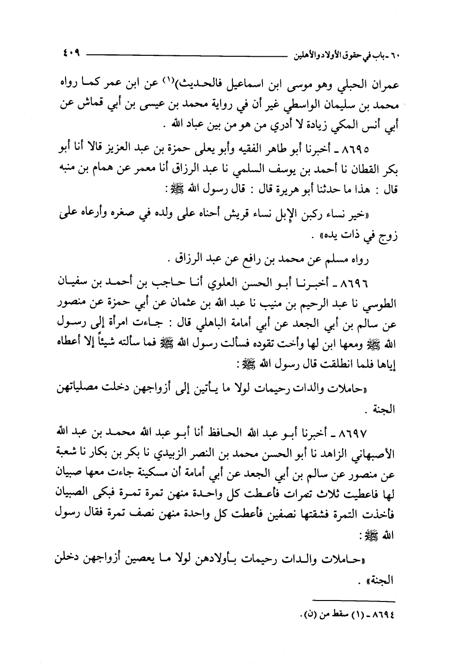 8696 - أخبرنا أبو الحسن العلوي أنا حاجب بن أحمد بن سفيان الطوسي نا عبد الرحيم بن منيب نا عبد الله بن عثمان عن أبي حمزة عن منصور عن سالم بن أبي الجعد عن أبي أمامة الباهلي قال : جاءت امرأة إلى رسول الله و معها ابن لها و أخت تقوده فسألت رسول الله صلى الله عليه و سلم فما سألته شيئا إلا أعطاه إياها فلما انطلقت قال رسول الله صلى الله عليه و سلم :