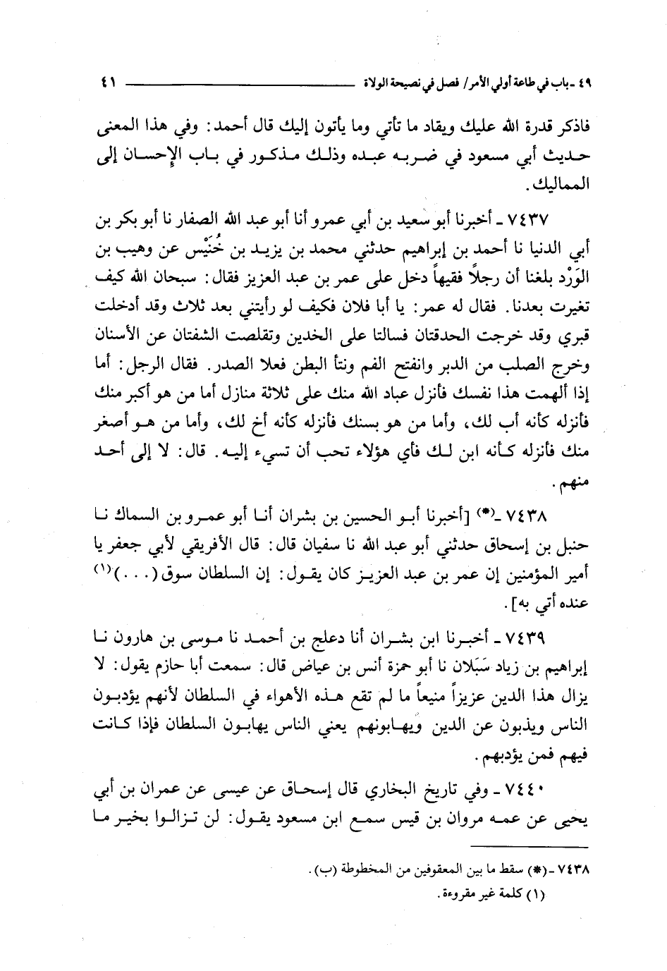 7440 - و في تاريخ البخاري قال إسحاق بن عيسى عن عمران بن أبي يحيى عن عمه مروان بن قيس سمع ابن مسعود يقول : لن تزالوا بخير ما صلحت أئمتكم قال أحمد و قد رويناه في معناه و أتم منه ما