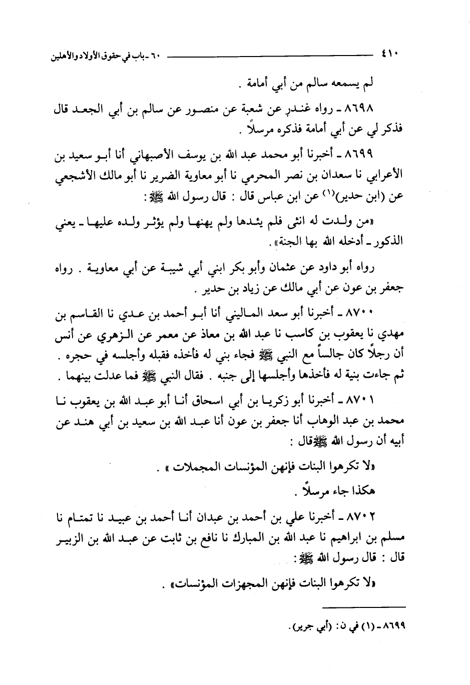 8701 - أخبرنا أبو زكريا بن أبي إسحاق أنا أبو عبد الله بن يعقوب نا محمد بن عبد الوهاب أنا جعفر بن عون أنا عبد الله بن سعيد بن أبي هند عن أبيه : أن رسول الله صلى الله عليه و سلم قال : لا تكرهوا البنات فإنهن المؤنسات المجملات