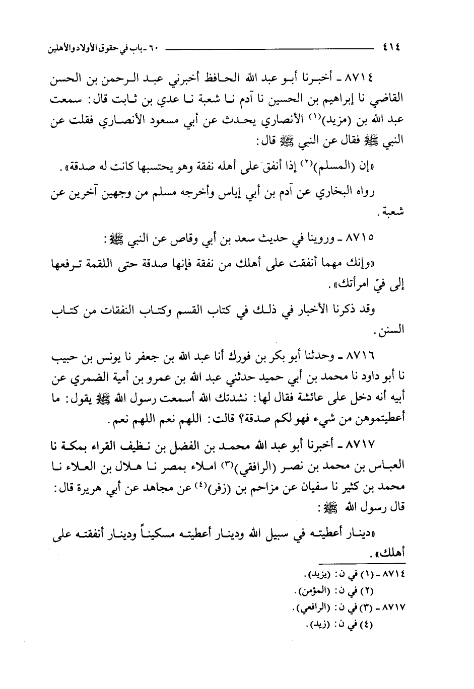 8715 - و روينا في حديث سعد بن أبي وقاص : عن النبي صلى الله عليه و سلم : وإنك مهما أنفقت على أهلك من نفقة فإنها صدقة حتى اللقمة ترفعها إلى في امرأتك