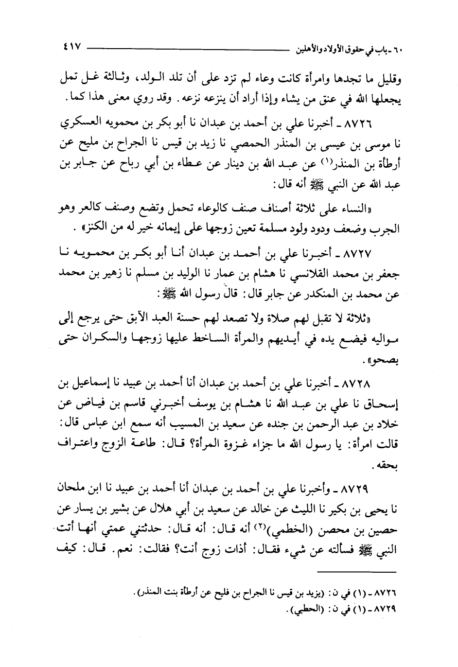 8729 - و أخبرنا علي بن أحمد بن عبدان أنا أحمد بن عبيد نا ابن ملحان نا يحيى بن بكير نا الليث عن خالد عن سعيد بن أبي هلال عن بشير بن يسار عن حصين بن محصن الخطمي أنه قال : أنه قال : حدثتنني عمتي : أنها أتت النبي صلى الله عليه و سلم فسألته عن شيء فقال : أذات زوج أنت ؟ فقالت : نعم قال : كيف أنت له ؟ قالت : يا رسول الله لا ألوه فقال : أحسني فإنه جنتك و نارك