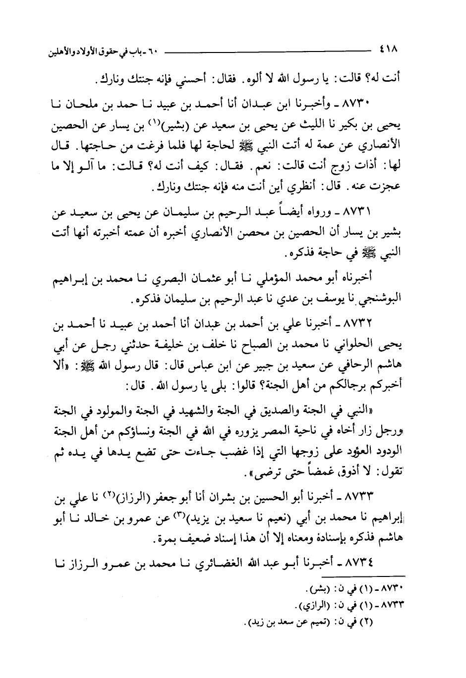 8730 - و أخبرنا ابن عبدان أنا أحمد بن عبيد نا حمد بن ملحان نا يحيى بن بكير نا الليث عن يحيى بن سعيد عن بشير بن يسار عن الحصين الأنصاري عن عمة له : أتت النبي صلى الله عليه و سلم لحاجة لها فلما فرغت من حاجتها قال لها : أذات زوج أنت قالت : نعم فقال : كيف أنت له ؟ قالت : ما آلو إلا ما عجزت عنه قال : انظري أين أنت منه فإنه جنتك ونارك