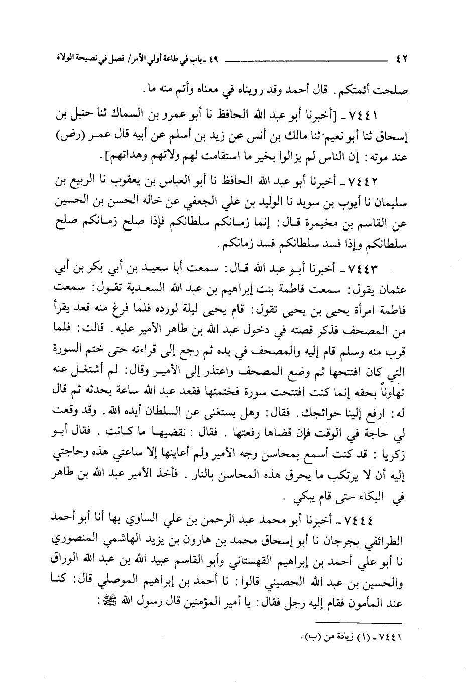 7443 - أخبرنا أبو عبد الله قال : سمعت أبا سعيد بن أبي بكر بن أبي عثمان يقول : سمعت فاطمة بنت إبراهيم بن عبد الله السعدية تقول : سمعت فاطمة امرأة يحيى بن يحيى تقول : قام يحيى ليلة لورده فلما فرغ منه قعد يقرأ من المصحف فذكر قصته في دخول عبد الله بن طاهر الأمير عليه قالت : فلما قرب منه و سلم قام إليه و المصحف في يده ثم رجع إلى قراءته حتى ختم السورة التي كان افتتحها ثم وضع المصحف و اعتذر إلى الأمير و قال : لم أشتغل عنه تهاونا بحقه إنما كنت افتتحت سورة فختمتها فقعد عبد الله ساعة يحدثه ثم قال له : ارفع إلينا حوائجك فقال : و هل يستغنى عن السلطان أيده الله و قد وقعت لي حاجة في الوقت فإن قضاها رفعتها فقال : نقضيها ما كانت فقال أبو زكريا : قد كنت أسمع بمحاسن وجه الأمير و لم أعاينها إلا ساعتي هذه و حاجتي إليه أن لا يرتكب ما يحرق هذه المحاسن بالنار فأخذ الأمير عبد الله بن طاهر في البكاء حتى قام يبكي
