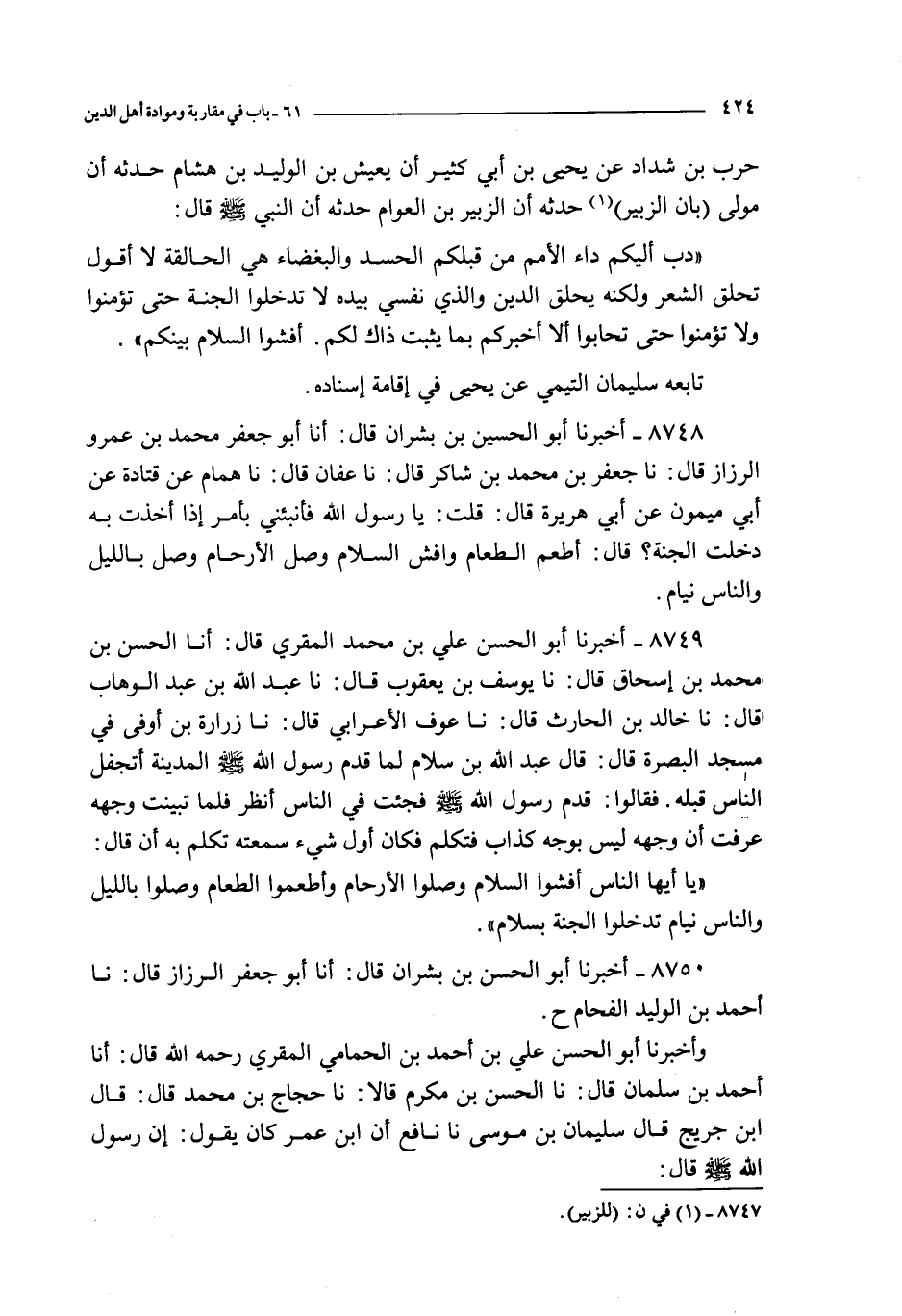 8749 - أخبرنا أبو الحسن علي بن محمد المقري قال : أنا الحسن بن محمد بن إسحاق قال : نا يوسف بن يعقوب قال : نا عبد الله بن عبد الوهاب قال : نا خالد بن الحارث قال : نا عوف الأعرابي قال : نا زرارة بن أوفى في مسجد البصرة قال : قال عبد الله بن سلام : لما قدم رسول الله صلى الله عليه و سلم المدينة أتجفل الناس قبله فقال : قدم رسول الله صلى الله عليه و سلم فجئت في الناس أنظر فلما تبينت وجهه عرفت أن وجهه ليس بوجه كذاب فتكلم فكان أول شيء سمعته تكلم به أن قال :