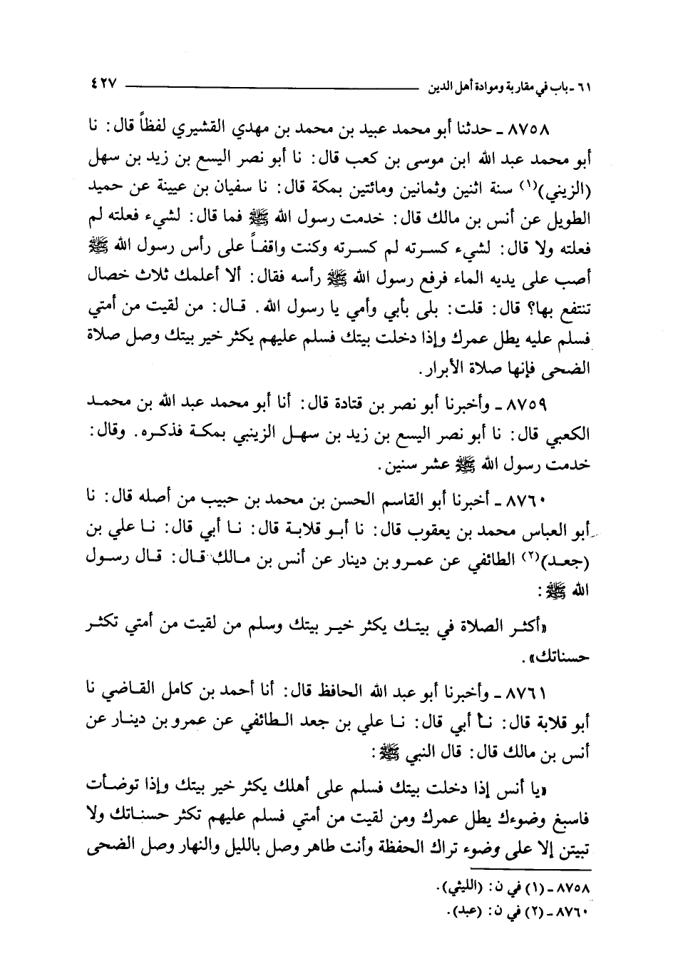 8761 - و اخبرنا أبو عبد الله الحافظ قال : أنا أحمد بن كامل القاضي نا أبو قلابة قال : نا أبي قال : نا علي بن جعد الطائفي عن عمرو بن دينار عن أنس بن مالك قال : قال النبي صلى الله عليه و سلم :