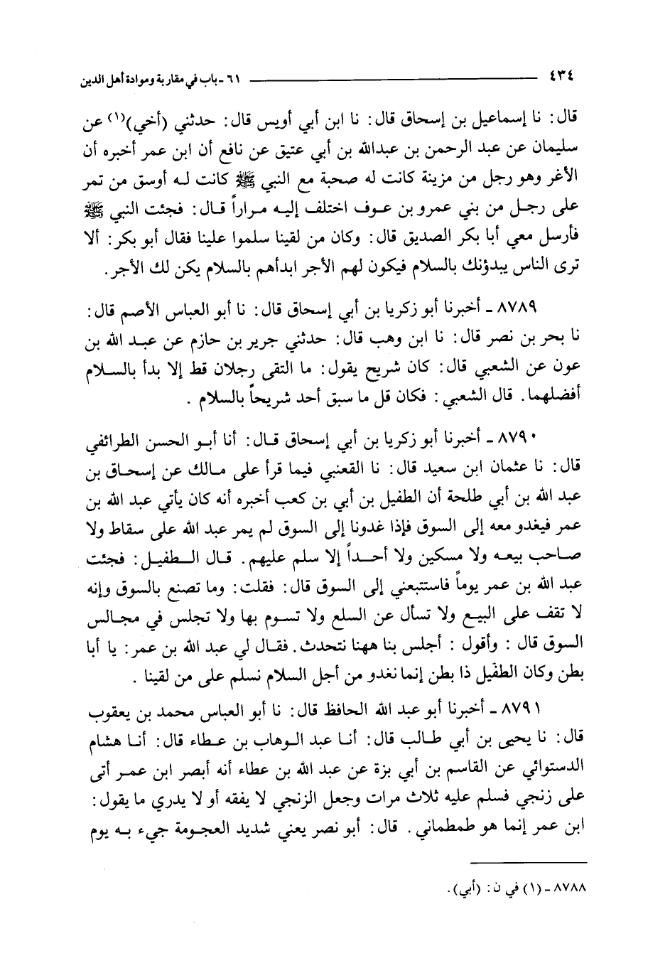 8790 - أخبرنا أبو زكريا بن أبي إسحاق قال : أنا أبو الحسن الطرائفي قال : نا عثمان ابن سعيد قال : نا القعنبي فيما قرأ على مالك عن إسحاق بن عبد الله بن أبي طلحة أن الطفيل بن أبي بن كعب أخبره : أنه كان يأتي عبد الله بن عمر فيغدو معه إلى السوق فإذا غدونا إلى السوق لم يمر عبد الله على سقاط و لا صاحب بيعه و لا مسكين و لا أحدا إلا سلم عليهم قال الطفيل : فجئت عبد الله بن عمر يوما فاستتبعني إلى السوق قال : فقلت : و ما تصنع بالسوق و إنه لا تقف على البيع و لا تسألى عن السلع و لا تسوم بها و لا تجلس في مجالس السوق قال : و أقول : أجلس بنا ههنا نتحدث فقال لي عبد الله بن عمر : يا أبا بطن و كان الطفيل ذا بطن إنما نغدو من أجل السلام نسلم على من لقينا