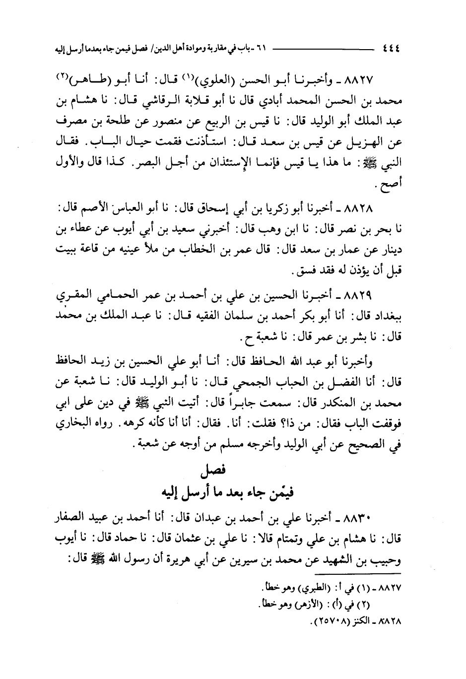 8829 - أخبرنا الحسين بن علي بن أحمد بن عمر الحمامي المقري ببغداد قال : أنا أبو بكر أحمد بن سلمان الفقيه قال : نا عبد الملك بن محمد قال : نا بشر بن عمر قال : نا شعبة ح