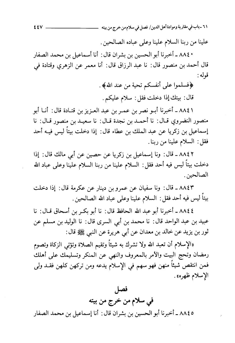 8842 - قال : و نا إسماعيل بن زكريا عن حصين عن أبي مالك قال : إذا دخلت بيتا ليس فيه أحد فقل : السلام علينا من ربنا السلام علينا و على عباد الله الصالحين