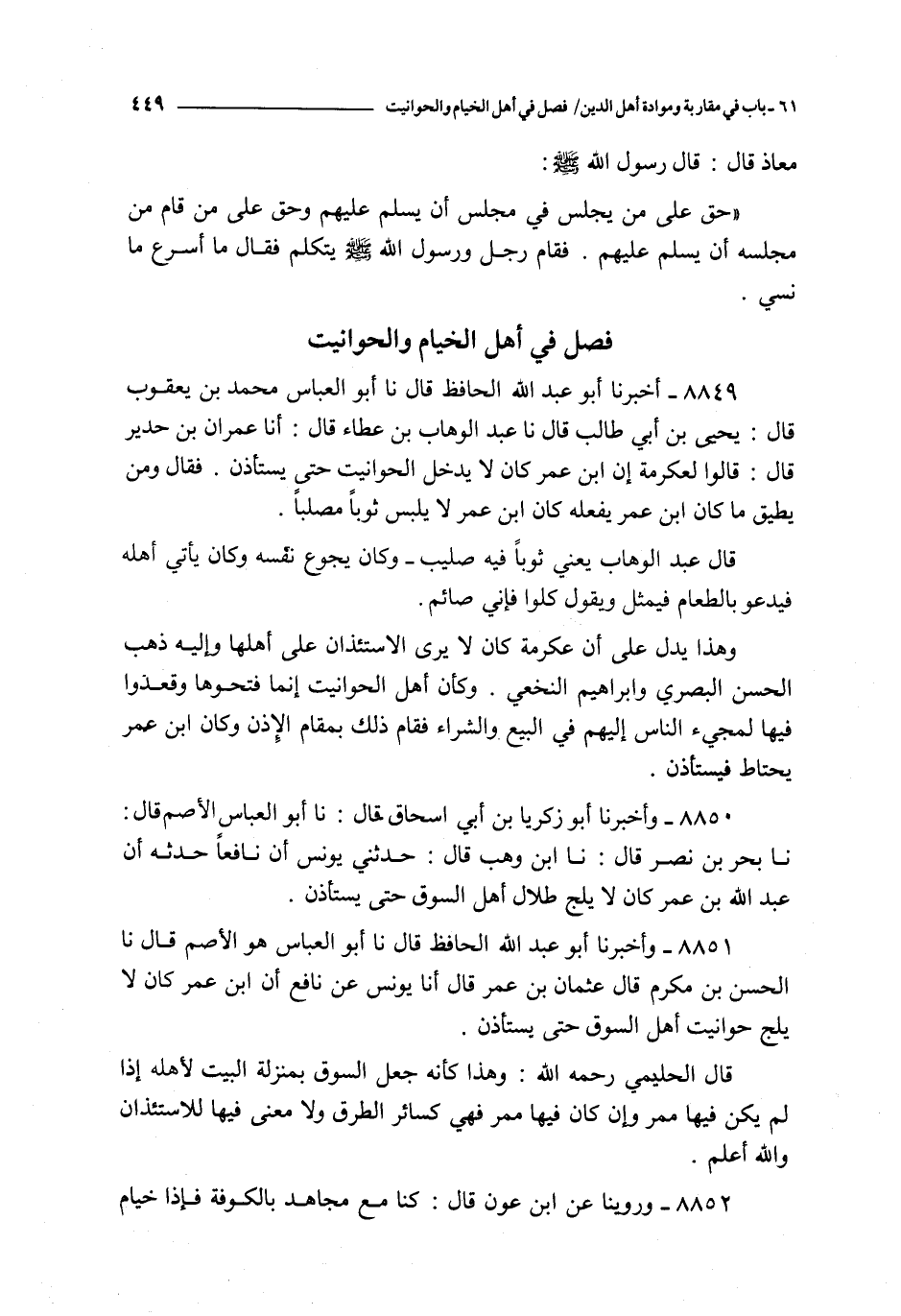 8849 - أخبرنا أبو عبد الله الحافظ قال نا أبو العباس محمد بن يعقوب قال : يحيى بن أبي طالب قال نا عبد الوهاب بن عطاء قال : أنا عمران بن حدير قال : قالوا لعكرمة إن ابن عمر كان لا يدخل الحوانيت حتى يستأذن فقال و من يطيق ما كان ابن عمر يفعله كان ابن عمر لا يلبس ثوبا مصلبا