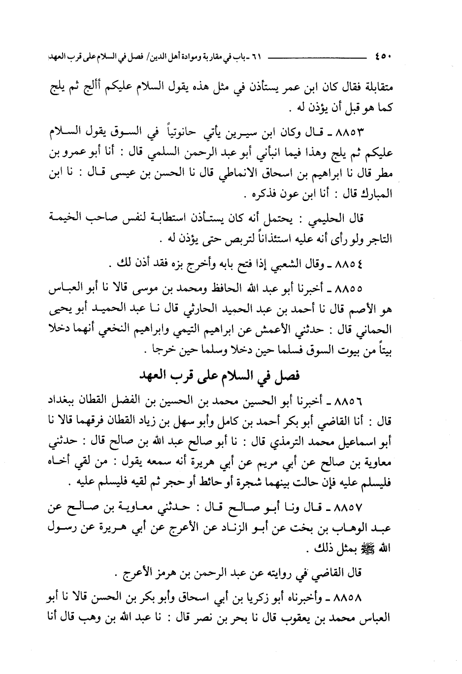 8858 - و أخبرناه أبو زكريا بن أبي إسحاق و أبو بكر بن الحسن قالا نا أبو العباس محمد بن يعقوب قال نا بحر بن نصر قال : نا عبد الله بن وهب قال أنا معاوية بن صالح عن أبي مريم عن أبي هريرة قال : إذا لقي أحدكم أخاه فليسلم عليه