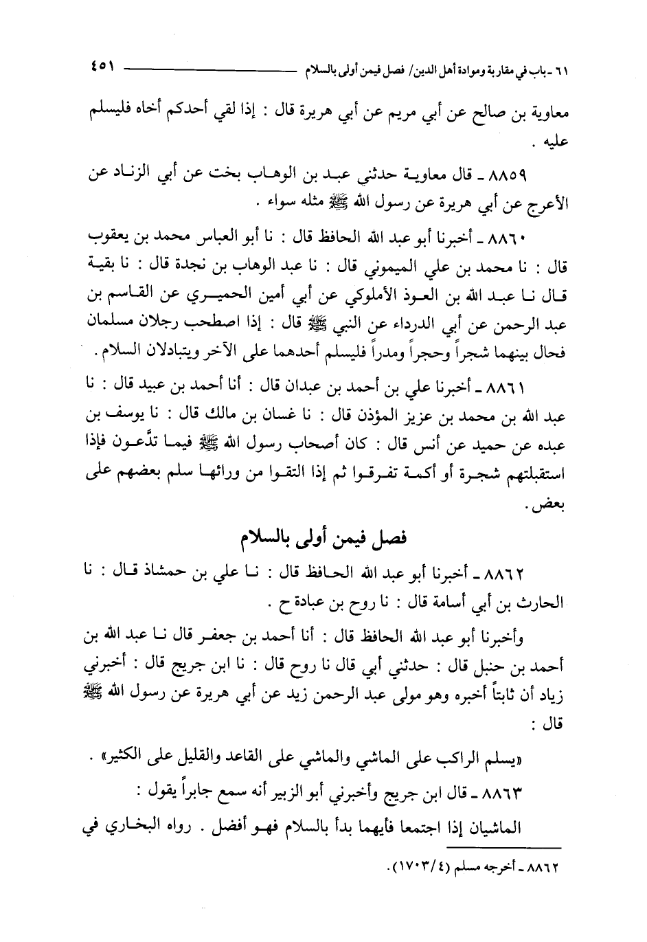 8863 - قال ابن جريج و أخبرني أبو الزبير أنه سمع جابرا يقول : الماشيان إذا اجتمعا فأيهما بدأ بالسلام فهو أفضل رواه البخاري في الصحيح عن إسحاق بن إبراهيم و رواه مسلم عن محمد بن مرزوق كلاهما عن روح دون رواية أبي الزبير