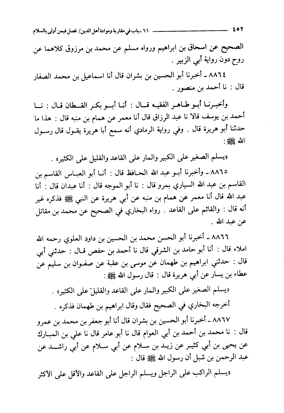 8865 - و أخبرنا أبو عبد الله الحافظ قال : أنا أبو العباس القاسم بن القاسم بن عبد الله السياري بمرو قال : نا أبو الموجه قال : أنا عبدان قال : أنا عبد الله قال أنا معمر عن همام بن منبه عن أبي هريرة : عن النبي صلى الله عليه و سلم فذكره غير أنه قال : و القائم على القاعد رواه البخاري في الصحيح عن محمد بن مقاتل عن عبد الله