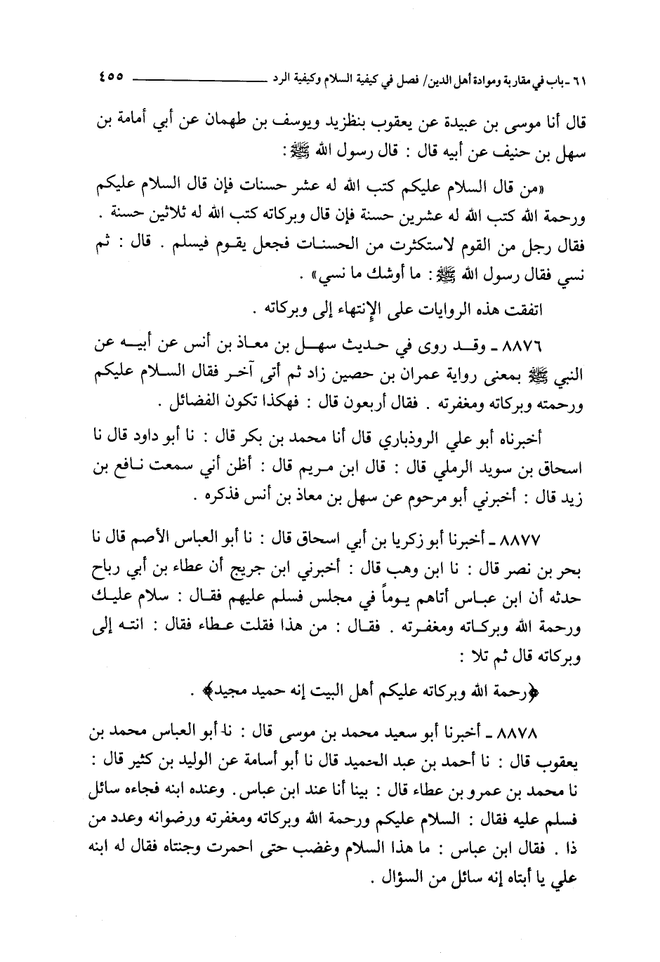 8878 - أخبرنا أبو سعيد محمد بن موسى قال : نا أبو العباس محمد بن يعقوب قال : نا أحمد بن عبد الحميد قال نا أبو أسامة عن الوليد بن كثير قال نا محمد بن عمرو بن عطاء قال : بينا أنا عند ابن عباس و عنده ابنه فجاءه سائل فسلم عليه فقال : السلام عليكم و رحمة الله و بركاته و مغفرته و رضوانه و عدد من ذا فقال ابن عباس : ما هذا السلام و غضب حتى احمرت وجنتاه فقال له ابنه علي يا أبتاه إنه سائل من السؤال