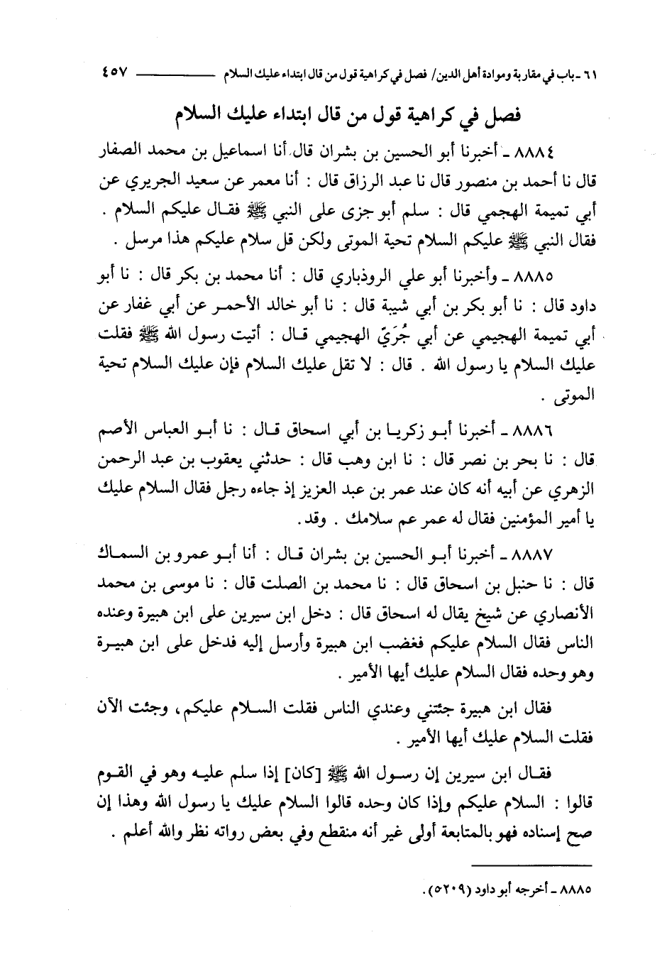 8885 - و أخبرنا أبو علي الروذباري قال : أنا محمد بن بكر قال : نا أبو داود قال : نا أبو بكر بن أبي شيبة قال : نا أبو خالد الأحمر عن أبي غفار عن أبي تميمة الهجمي عن أبي جري الهجيمي قال : أتيت رسول الله صلى الله عليه و سلم فقلت عليك السلام يا رسول الله قال : لا تقل عليك السلام فإن عليك السلام تحية الموتى