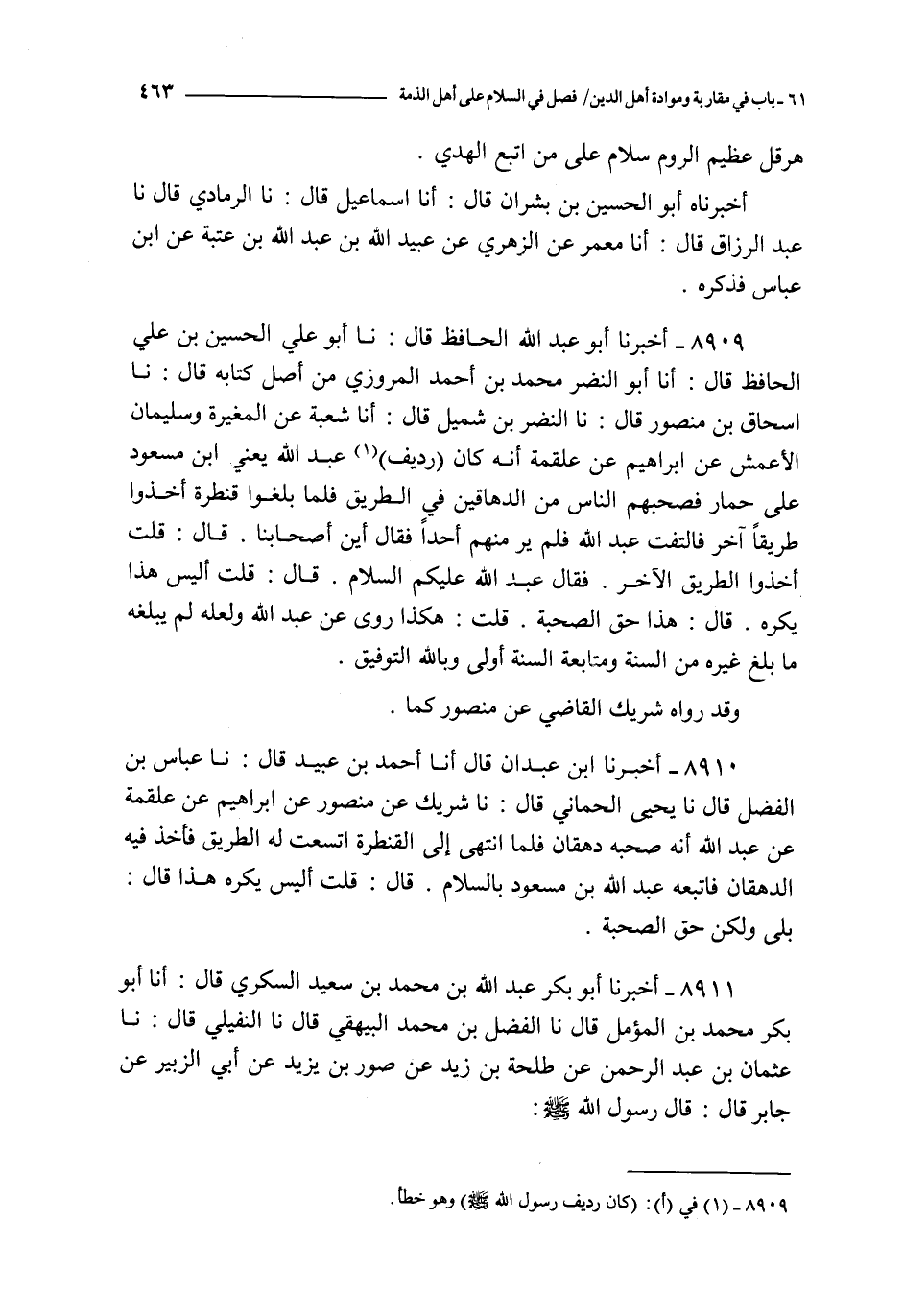 8909 - أخبرنا أبو عبد الله الحافظ قال : نا أبو علي الحسين بن علي الحافظ قال : أنا أبو النضر محمد بن أحمد المروزي من أصل كتابه قال : نا إسحاق بن منصور قال : نا النضر بن شميل قال : أنا شعبة عن المغيرة و سليمان الأعمش عن إبراهيم بن علقمة : أنه كان رديف عبد الله يعني ابن مسعود على حمار فصحبهم الناس من الدهاقين في الطريق فلما بلغوا قنطرة أخذوا طريقا آخر فالتفت عبد الله فلم ير منهم أحدا فقال أين أصحابنا قال : قلت أخذوا الطريق الآخر فقال عبد الله عليكم السلام قال : قلت أليس هذا يكره قال : هذا حق الصحبة قلت : هكذا روى عن عبد الله و لعله لم يبلغه ما بلغ غيره من السنة و متابعة السنة أولى و بالله التوفيق