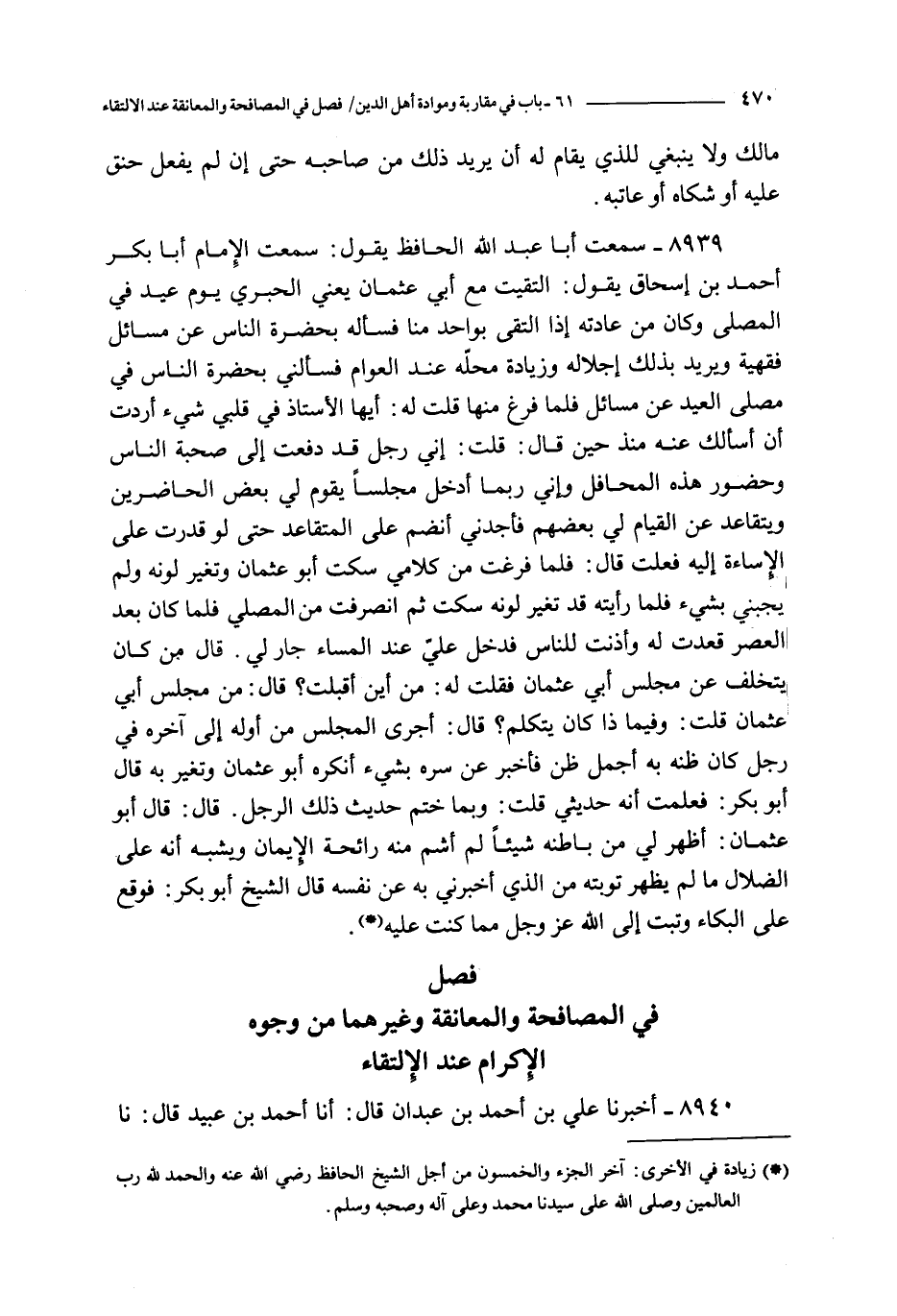 فصل في المصافحة و المعانقة و غيرهما من وجوه الإكرام عند الالتقاء
