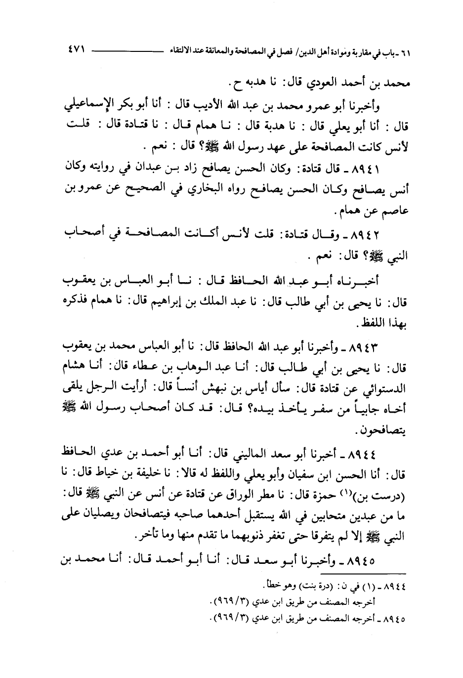 8941 - قال قتادة : و كان الحسن يصافح زاد بن عبدان في روايته و كان أنس يصافح و كان الحسن يصافح رواه البخاري في الصحيح عن عمرو بن عاصم عن همام