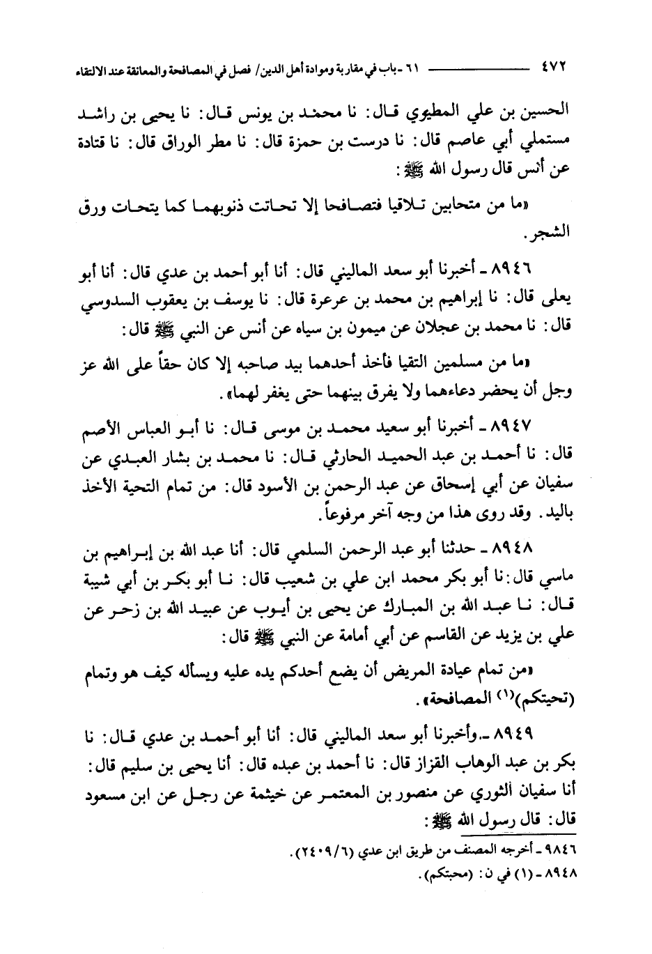 8949 - و أخبرنا أبو سعد الماليني قال : أنا أبو أحمد بن عدي قال : نا بكر بن عبد الوهاب القزاز قال : نا أحمد بن عبده قال : أنا يحيى بن سليم قال : أنا سفيان الثوري عن منصور بن المعتمر عن خيثمة عن رجل عن ابن مسعود : إن تمام التحية الأخذ باليد