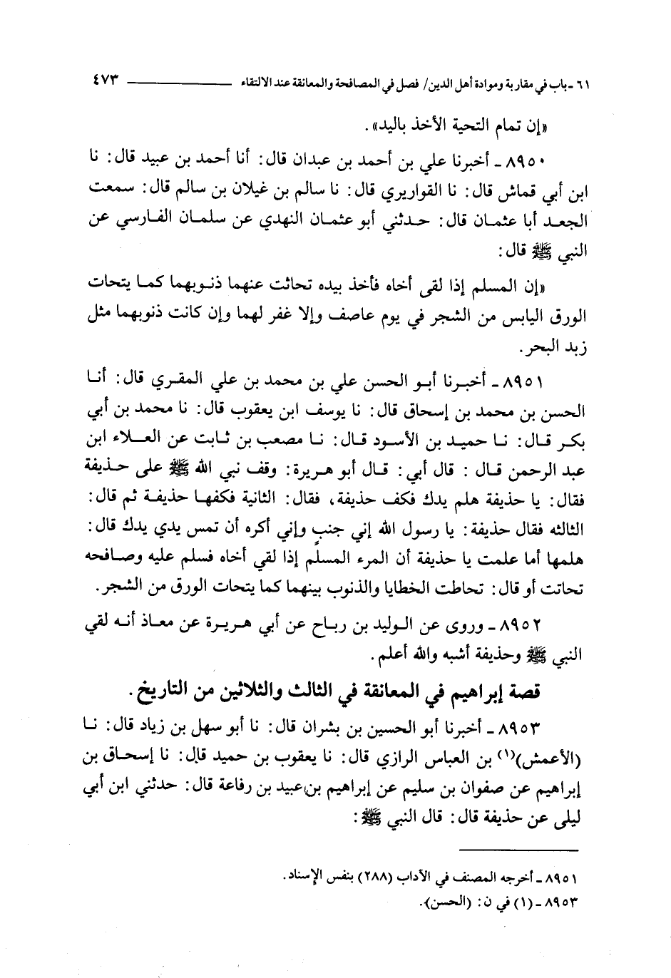 8951 - أخبرنا أبو الحسن علي بن محمد بن علي المقري قال : أنا الحسن بن محمد بن إسحاق قال : نا يوسف بن يعقوب قال : نا محمد بن أبي بكر قال : نا حميد بن الأسود قال : نا مصعب بن ثابت عن العلاء ابن عبد الرحمن قال : قال أبي : قال أبو هريرة : وقف نبي الله صلى الله عليه و سلم على حذيفة فقال : يا حذيفة هلم يدك فكف حذيفة فقال : الثانية فكفها حذيفة ثم قال : الثالثة فقال حذيفة : يا رسول الله إني جنب و إني أكره أن تمس يدي يدك قال : هلمها أما علمت يا حذيفة أن المرء المسلم إذا لقي أخاه فسلم عليه و صافحه تحاتت أو قال : تحاطت الخطايا والذنوب بينهما كما يتحات الورق من الشجر