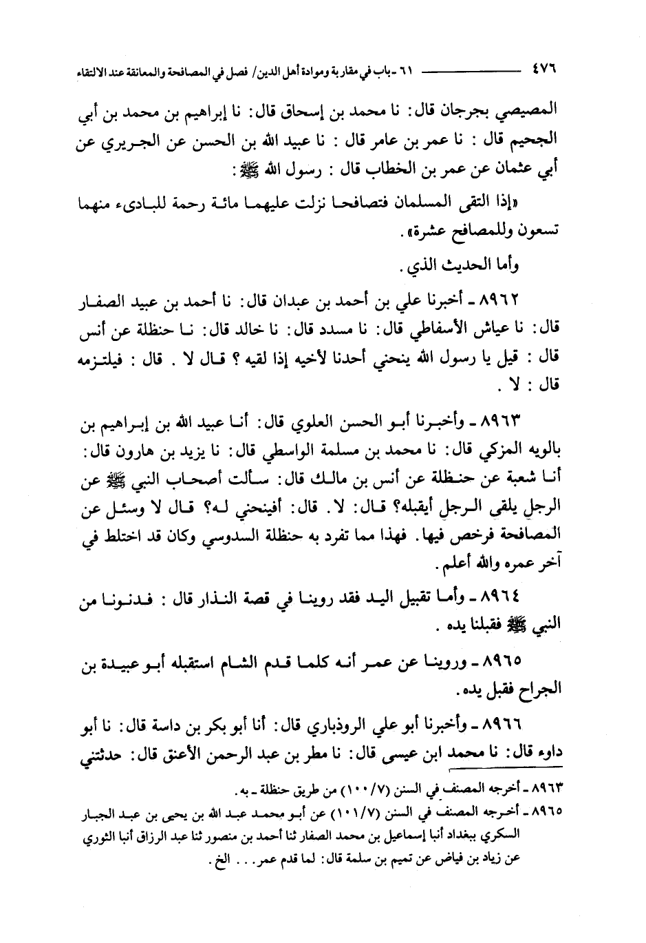 8962 - أخبرنا علي بن أحمد بن عبدان قال : نا أحمد بن عبيد الصفار قال : نا عياش الأسفاطي قال : نا مسدد قال : نا خالد قال : نا حنظلة عن أنس قال : قيل يا رسول الله ينحني أحدنا لأخيه إذا لقيه ؟ قال لا : قال : فيلتزمه قال : لا