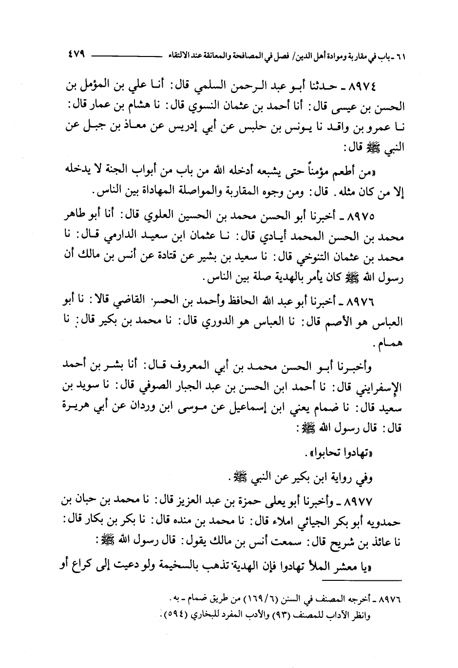 من أطعم مؤمنا حتى يشبعه أدخله الله من باب من أبواب الجنة لا يدخله إلا من كان مثله قال : و من وجوه المقاربة و المواصلة المهاداة بين الناس