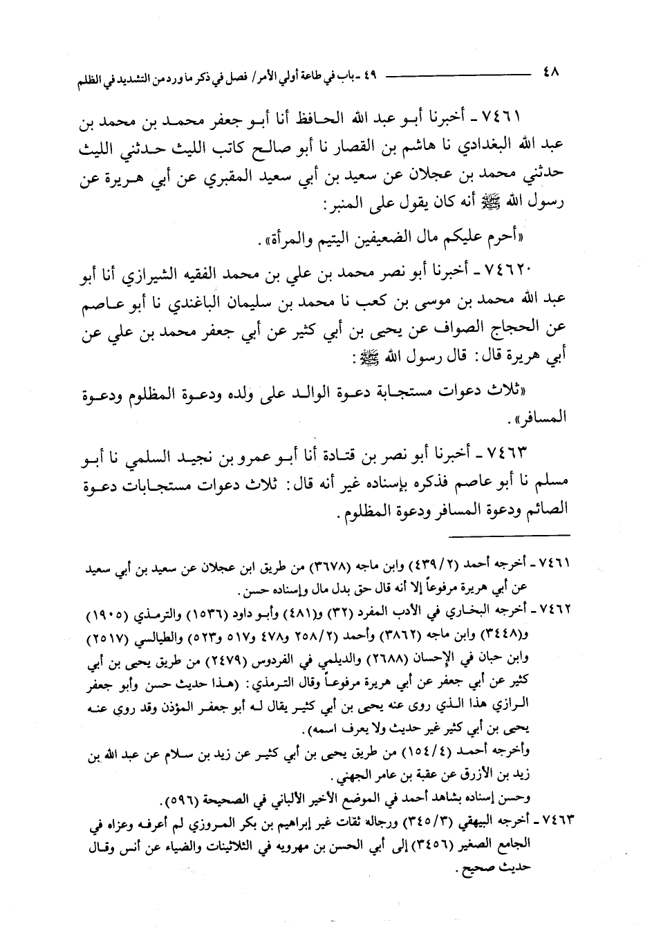 7463 - أخبرنا أبو نصر بن قتادة أنا أبو عمرو بن نجيد السلمي نا أبو مسلم نا أبو عاصم : فذكره بإسناده غير أنه قال : ثلاث دعوات مستجابات دعوة الصائم و دعوة المسافر ودعوة المظلوم
